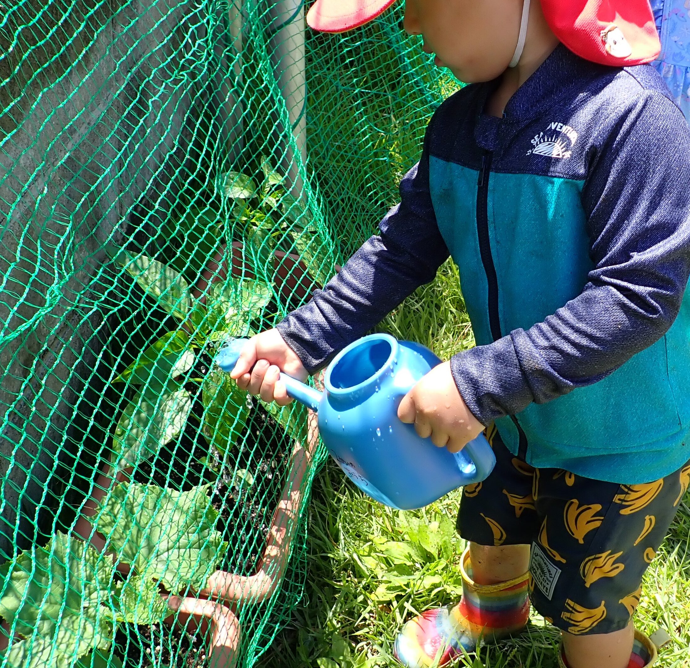 2階のお家では、夏野菜を植えました。自分たちで育たい野菜を話し合いで決め、プランターに植えましたよ。野菜の担当も決めて、お世話をしている最中の子どもたちです。お外遊びの時に、水やりをしたり、観察してみたりとしています。大きくなるのを心待ちにしていますよ~。