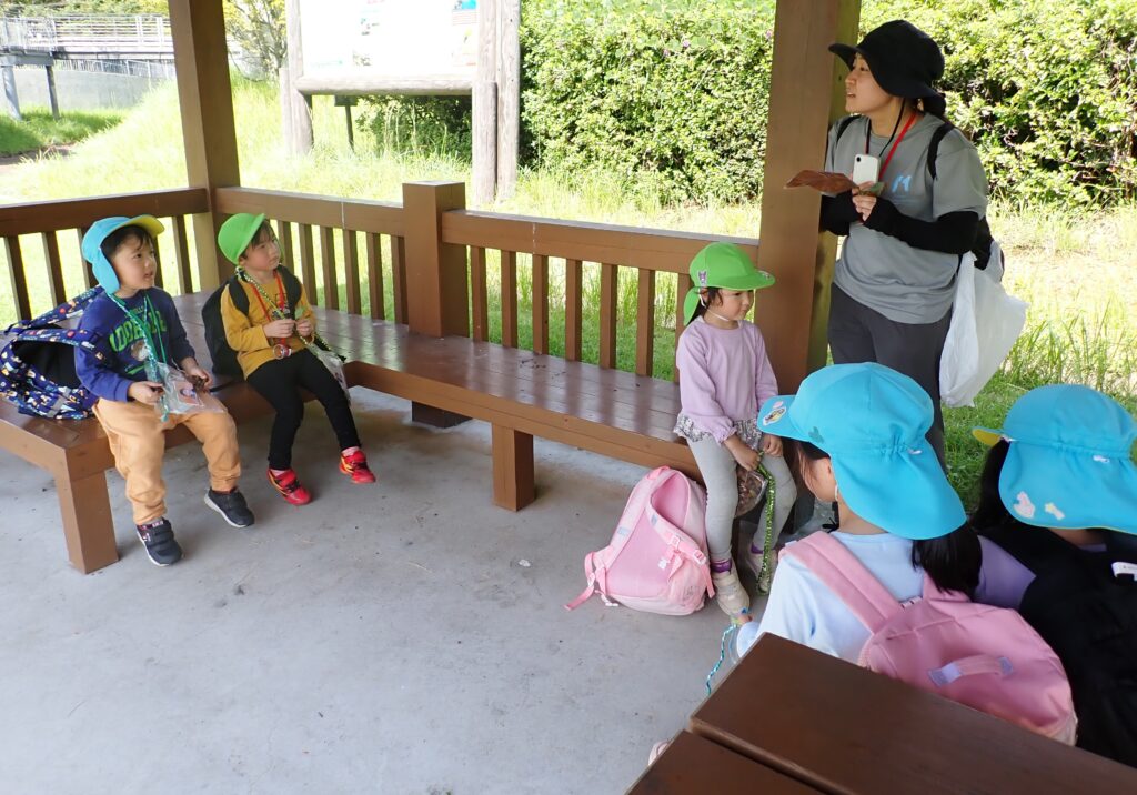 頂上でお弁当や好きな遊びを楽しんだ後、自分が拾った葉っぱや木のみについて紹介してもらいました。