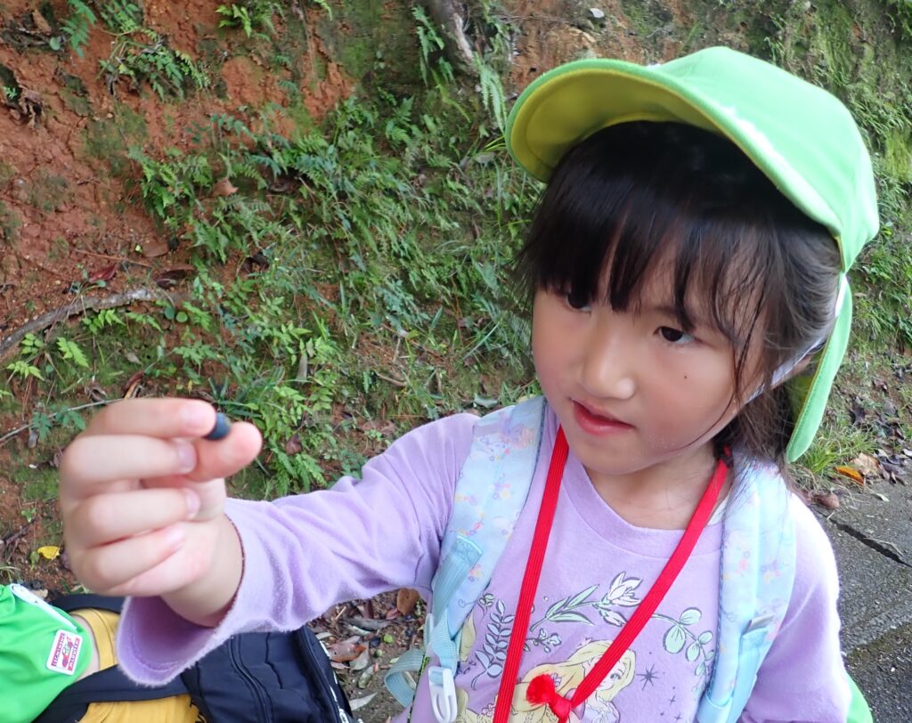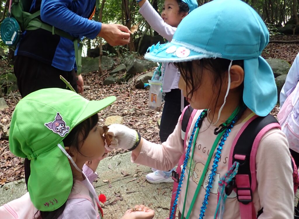 ムッレ教室では、中尾山に様々な葉っぱを探しに行ってきました!園では見つけられない、大きな葉っぱ・ち~さい葉っぱ・カラフルな色の葉っぱ・面白い形の葉っぱ等見つけて楽しみましたよ。また、栗やどんぐりなどの秋の実も沢山見つけて、拾って、宝物バックいっぱいになる子の姿もありました。秋の自然を思いっきり楽しみました。