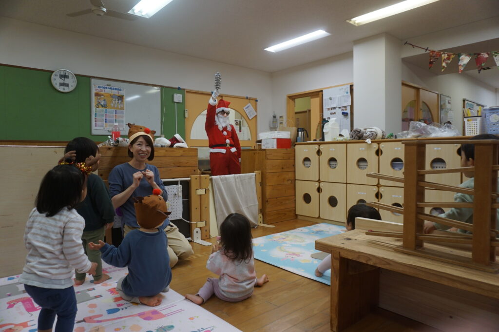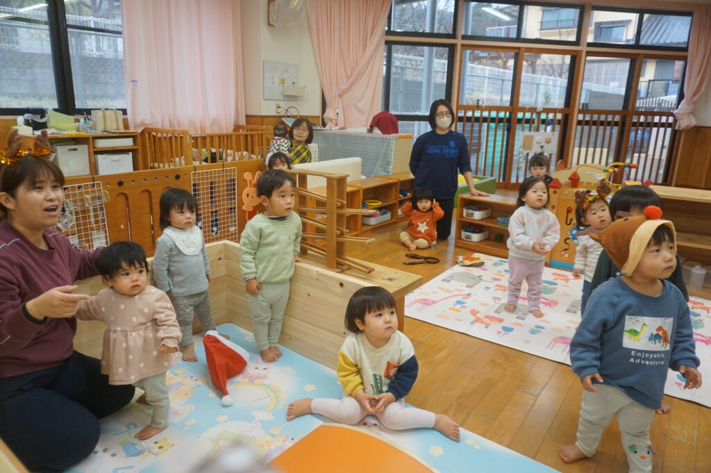 また0・1歳クラスでは25日にクリスマス会を行いました。保育者の出し物や音楽など、初めての雰囲気に少し緊張する姿も見られましたが、友だちや保育者と一緒に過ごす中で自然と笑顔が溢れました。