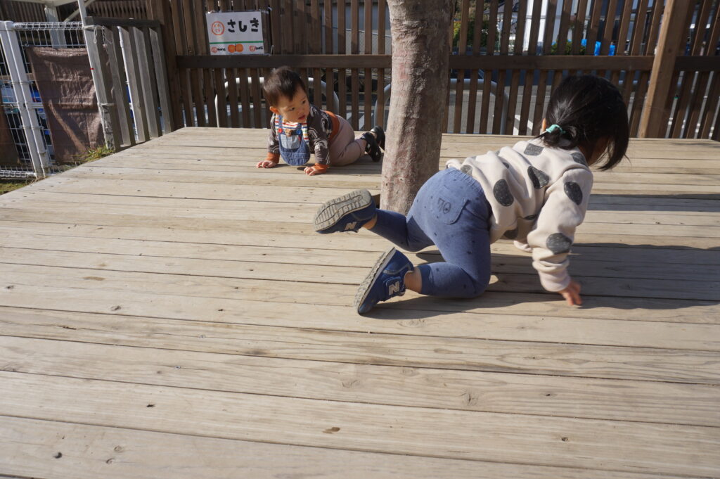 最近のおひさまのおうち(1/19~1/23) お知らせ 2026.01.26 先週は天気の良い気が多く、園庭に出て戸外あそびを楽しみました! ウッドデッキでは、ハイハイでゆっくりと進んだり、行き来を繰り返したりしながら、広い空間で体をたくさん動かす姿が見られました。 日差しの心地よい時間帯に日向ぼっこしたり、外の空気や光を感じながら、穏やかな時間を過ごしています。 一人ひとりが安心できる環境の中で、それぞれのペースを大切にしながら、心と体をゆったりと育む一週間になりました。