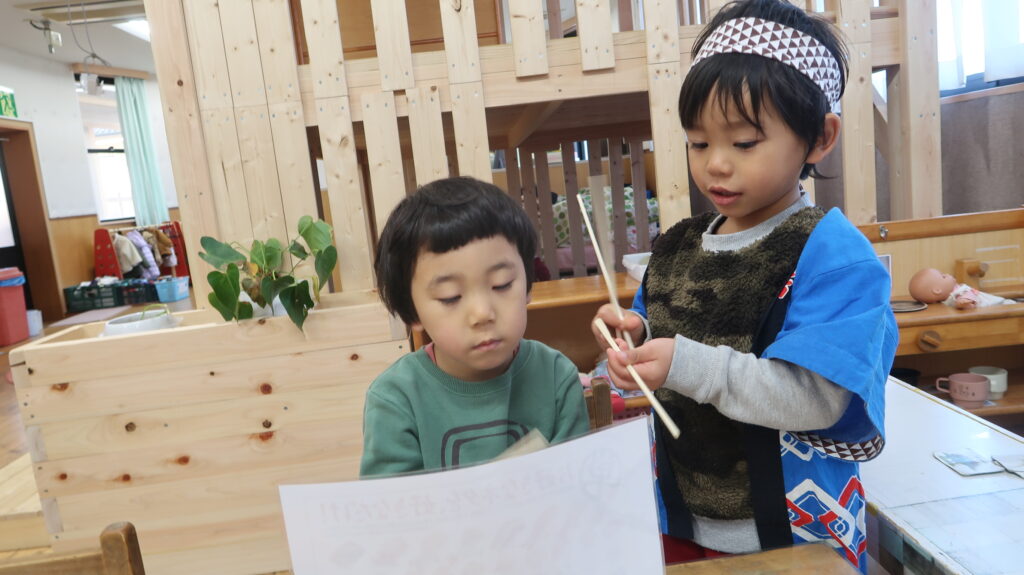 1階のおうちではお寿司屋さんが大流行!はちまきを巻いて法被を着てお寿司屋さんを楽しんでいます。「僕が店長するね」などとそれぞれ役職を決めながら役になりきることや言葉でのやり取りなどに夢中になっています。お客さんもメニュー表を見ながら好きなネタを頼んで楽しんで参加しています。