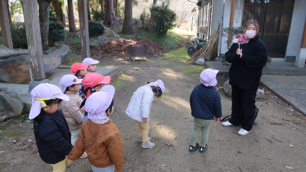 2・3歳児さんはクニュータナ教室がありました。ニッケさんとの再会に、にこにこ笑顔で喜んでいましたよ。みんなで走って風をたくさん吹かせたり、霜を探したりなど冬の自然との触れ合いをじっくりと楽しむ時間になりました。