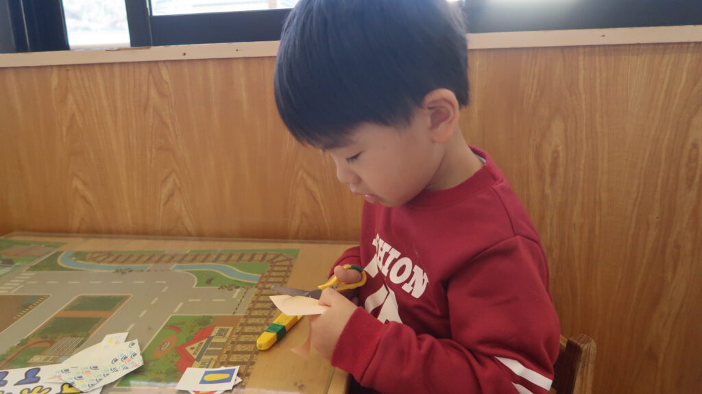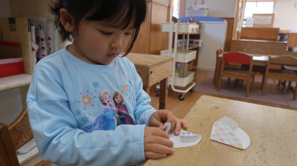 2歳児さんも折り紙で着物作りに挑戦!お話もよく聞いていて、指先を器用に動かしてイメージする折り方が出来るようになってきています。出来上がりが楽しみですね~!