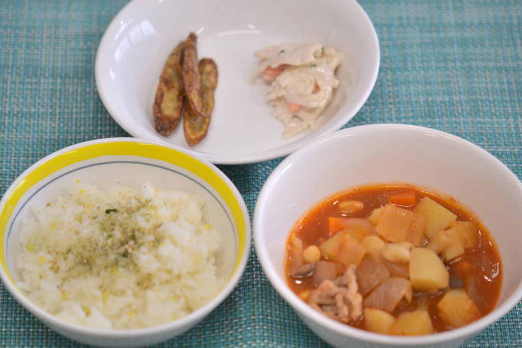今日は園でも豆まき会という事で、炒り大豆は誤嚥などの危険性があるため、柔らかく炊いた大豆を使ったポークビーンズ!!昆布だしに、ホールトマト、手作りケチャップ、しょうゆ、みりんで味付けしたトマト味のスープです。コク・うま味を出すため、玉ねぎ麹を使って味付けしました~。3時のおやつは、年齢によって違います。酒かすクラッカーはとっても固いので、1歳児さんは、黒糖クッキーでした。カミカミメニューの酒かすクラッカー。酒かすがチーズのような風味を出してくれます。