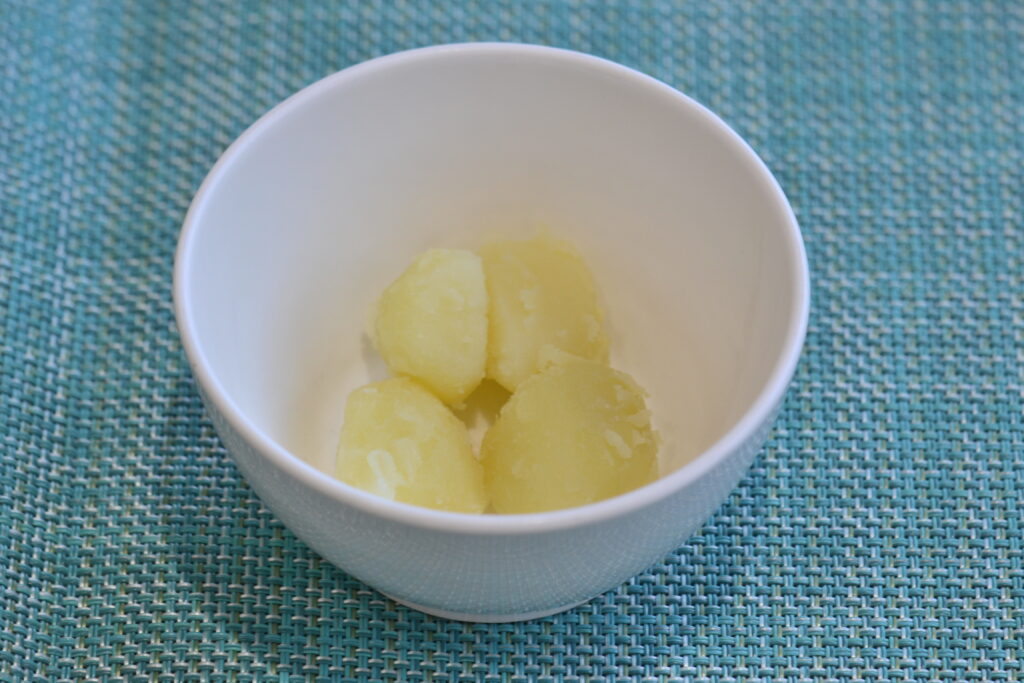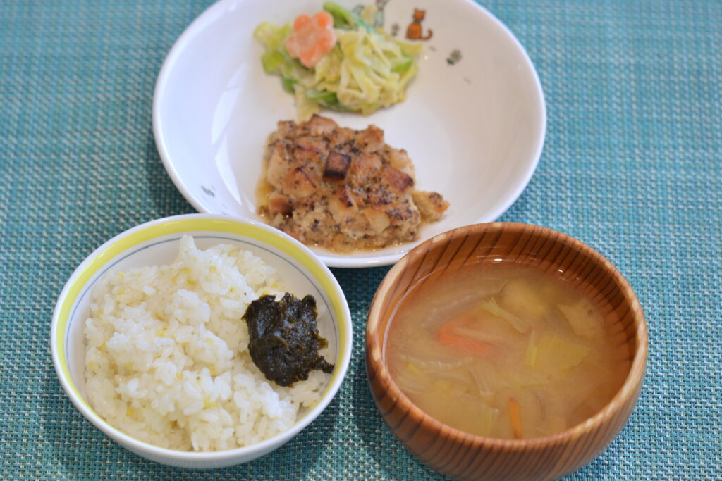 今日の昼食は、『高野豆腐と野菜の煮物』でした。柔らかく戻してコロコロに切った高野豆腐に、鶏ミンチ、みじん切りにした椎茸や玉ねぎ、人参、きくらげなどの野菜を混ぜ込み、昆布やかつおでとっただしをみりん、しょうゆで味付けたつゆと共に蒸し焼きにしています。
