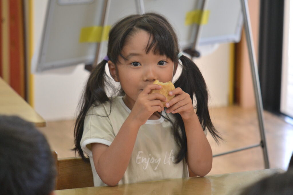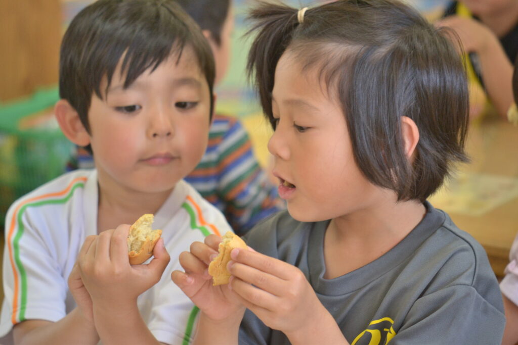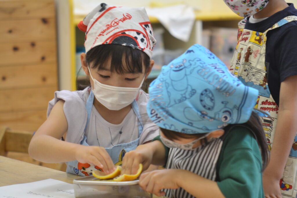今日は午後から、2階の年中年長さんとクッキングをしました。年長さんが収穫してきた甘夏の外皮を使って、『甘夏スコーン』を作りましたよ♪年長さんは、おろし金で外皮の黄色い部分のみをすりおろす作業を担当しました。指先をケガしやすい工程でしたが、集中し、互いに声を掛け合いながら協力して上手に行っていました。年中さんが作った生地に混ぜ込み、丁寧に丸め、1階のお家・2階のお家のお友達みんなの分を愛情込めて作りました(*^-^*)♥「見てここ!甘夏の皮入ってる!」「いい匂いがして美味しい♪」と言って、みんな美味しそうに食べていましたよ🌟