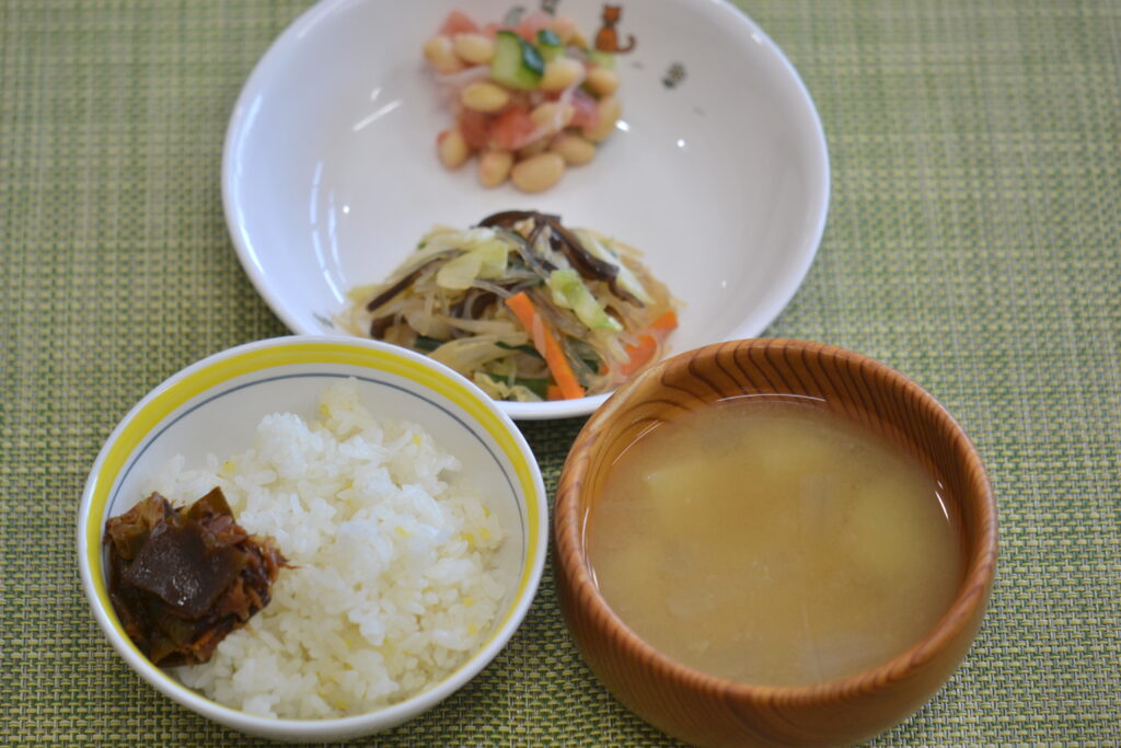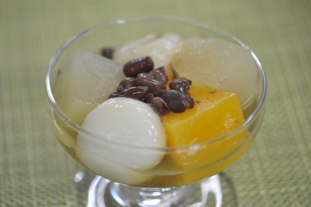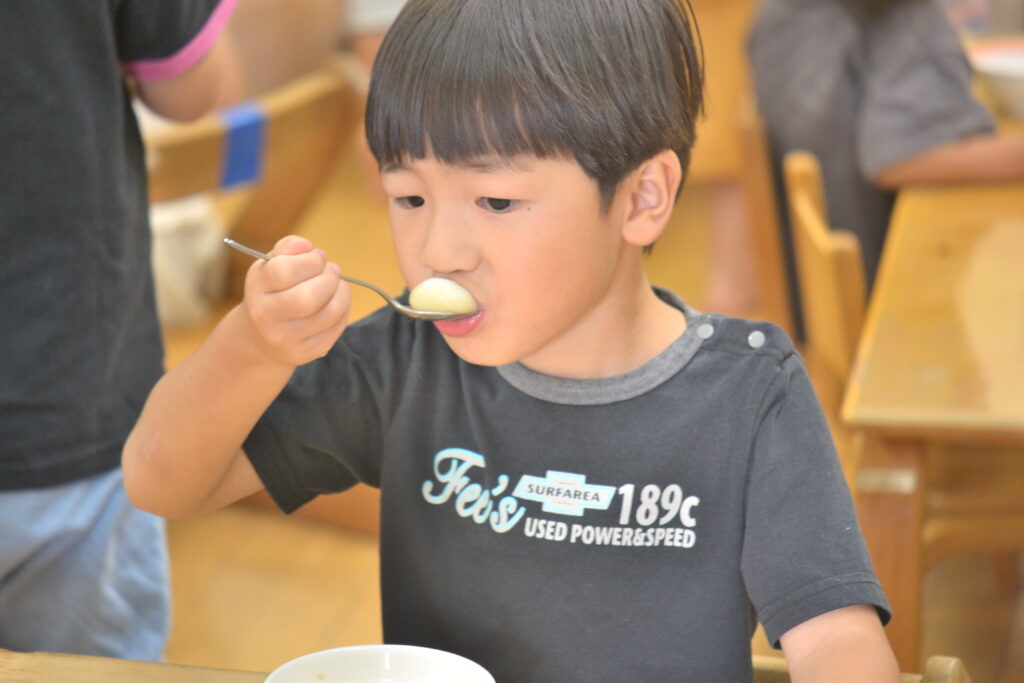 今日は、昼食に夏季限定の副菜『トマトと豆のサラダ』が登場しました❣コロコロに切ったトマトときゅうりに、梅酢に漬けた玉ねぎ、大豆を混ぜ合わせ、酢と塩のみで味を整えます。それぞれの野菜の味が合わさって、味付けが塩と酢のみとは思えない深い味になりますよ😊3時のおやつは、『フルーツみつ豆』でした。りんご寒天にオレンジ寒天、白玉団子、甘さ控えめに煮た小豆をシロップと一緒にいただきます。暑さで火照った体にひんやりしみる美味しいおやつでした🌞2歳児さんは豆腐入りの噛みやすい団子入りを、1歳児さんは団子無しのフルーツ寒天と小豆をシロップで食べました。