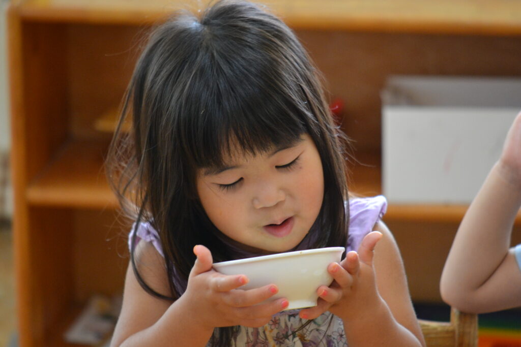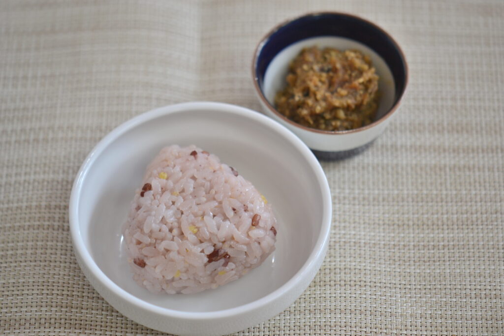 今日の3時のおやつは『雑穀米入りおにぎり🍙』と、初登場の『いりこ味噌』でした。おにぎりには、赤米・黒米・もちきびが入っています。そして、初登場のいりこ味噌は、みそ汁のだしに使ったいりこを使用して作りました。カリカリに焼いて臭みをとばしたいりこを刻み、みそ・みりん・自家製甘酒・ごまと一緒に炒めて作りました。普通の甘辛味噌の時は苦手な子が多かったのですが、いりこが入っていないのと入っているのとでは反応が大違い!!「これ美味しい♥」「またこれがいい♪」と、子どもたちにも大好評でした。
