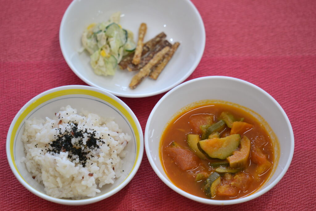 今日の昼食は『ラタトゥイユ』でした。トマト、玉ねぎ、ピーマン、かぼちゃ、ズッキーニ、なす、ホールトマト・・・と、夏野菜たっぷり🍅✨野菜の甘みと、自家製ケチャップの旨味がよく合いとっても美味しかったですよ😋✨温かいままでも美味しいですが、最近は暑い日が続いていたので、今日はちょっとだけ冷やして食べました。3時のおやつは『冷やしぜんざい』でした。小豆をグツグツ煮て、甘さ控えめの自家製あんこと黒砂糖で味付けしています。最低限の甘さになるよう黒砂糖の使用は控え、味が薄いと感じないよう塩を絶妙な塩梅で加え味のバランスを取っています💡小豆は『腎臓(体内の老廃物を尿として排泄し、体内の水分調節をしてくれる臓器)』の働きを良くしてくれる食材なので、この時期は積極的に取りたい食材ですね😊💕