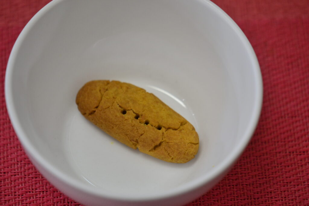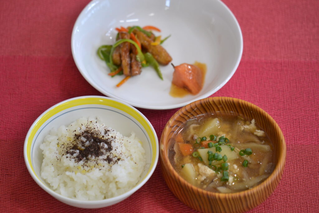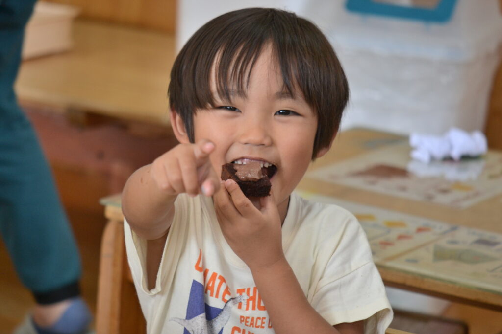 今日の副菜は『高野豆腐のチンジャオロース』でした。お肉の代わりに、下味をしっかりつけて揚げた高野豆腐を使用しています。こしこば菜園さんの甘くて美味しいピーマンと一緒に炒め、高野豆腐を漬け込んでおいたタレとみそを絡めています。味も風味もしっかりしているのでご飯のおかずになります♪子どもたちにも人気でした😋✨3時のおやつは『ココアケーキ』でした。これも小麦粉・卵・乳製品は一切使用せずに作っています。米粉と豆乳をメインに使い、ふわふわに焼き上げました♪豆腐とココアパウダーで作ったチョコクリームをお好みでつけて食べました♥おひげが出来てる子がたくさんいてかわいかったですよ🥰*゜