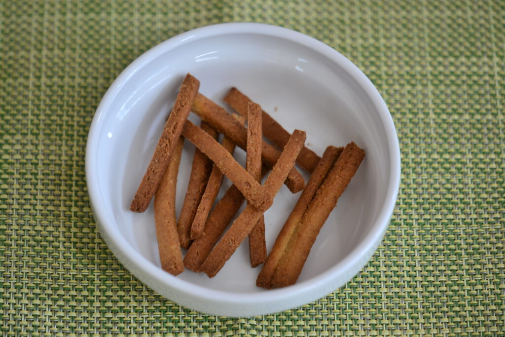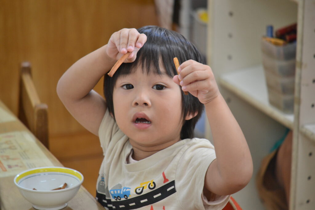 今日の昼食は大豆のから揚げでした。大豆たんぱくを凝縮したものにしょうゆ、みりん、ニンニクなどで味をつけ、片栗粉をまぶして揚げています。子どもたちも大好きな、ご飯がすすむおかずです😋✨3時のおやつは『酒かすクラッカー』でした(3~5歳児)。お隣の津奈木町にある亀萬酒造さんの玄米酒かすを使用しています。米粉や大豆と一緒にこね、細く切ってオーブンで焼いています。不思議と、チーズのような風味のする美味しいおやつです🧀💕少し硬めなので、1・2歳児さんは『みそおじや』にしました。