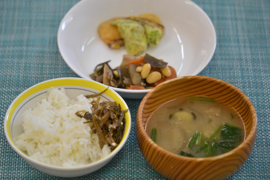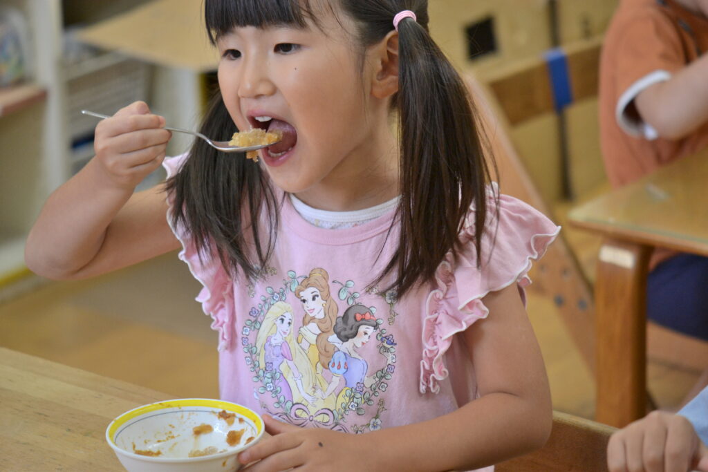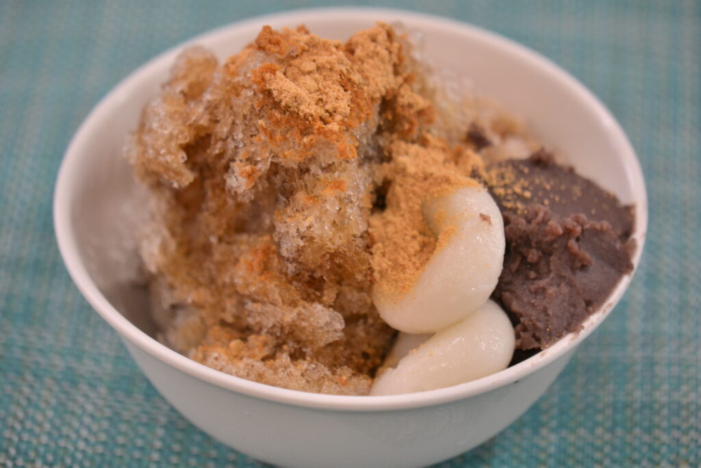 今日の昼食は、『大豆の五目煮』でした。五目煮は、大豆にごぼう、人参、椎茸、野菜昆布、こんにゃく、じゃが芋、高野豆腐などの、体に良い具材がたっぷりで、色んな味や食感を感じられましたよ😊久しぶりに登場したのが、『いりこの佃煮』❣だしをとった後のいりこをカリっと炒って臭みをとり、刻み昆布とみりん、しょうゆで甘辛くたきます。カルシウムもたっぷり、ご飯のお供にピッタリの佃煮でした。3時のおやつは、『黒みつ白玉かき氷』でした。本格的なかき氷機でする、フワフワの氷の上には、白玉団子、黒みつ、きな粉、自家製のあんこが乗ります。1歳児さんはお腹を冷やしすぎない様、「黒みつくず切り」を食べました(^^♪
