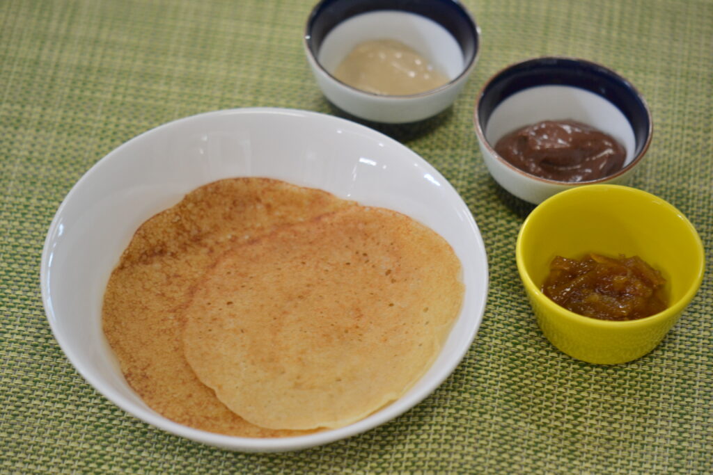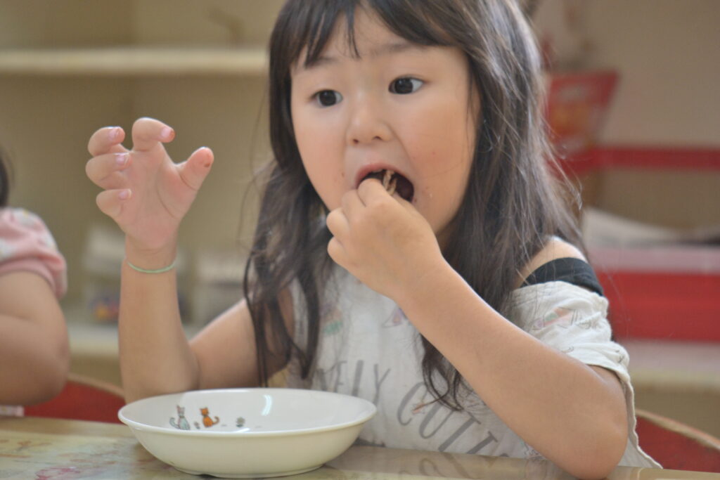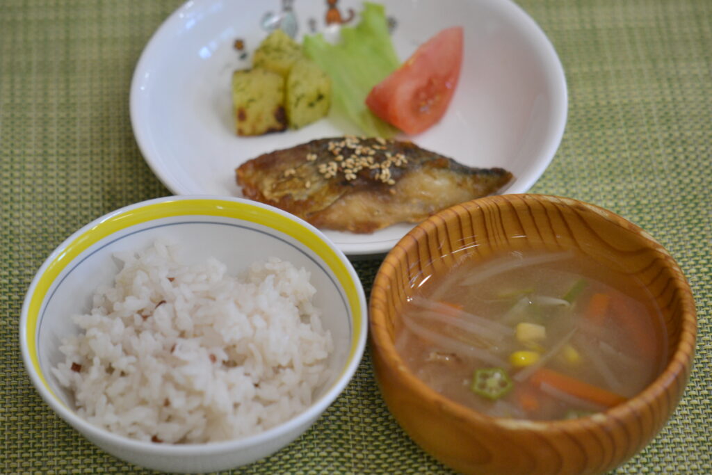 今日の昼食は、『魚のごま照り焼き』でした🐟🐟片栗粉をまぶした魚を焼いて、甘辛しょうゆとごまを絡めています。今日の魚は…「サバ」でした❣そして今日の汁物は、『野菜スープ』でした。園の野菜スープはコンソメなどの市販の調味料は使わず、昆布だしと、自家製の「玉ねぎ麹」で味をつけます。とっても優しく、コクのあるスープに仕上がりますよ~😊3時のおやつは、『クレープ』♥♥今日は年長さんが自分たちの分のクレープ作りに挑戦しました❣いつも人気な園の手作りクレープですが、今日はまた格別に美味しかったようです(^^♪トッピングは職員が作った、豆乳クリーム、豆乳チョコ、甘夏ジャム、の3種でした。