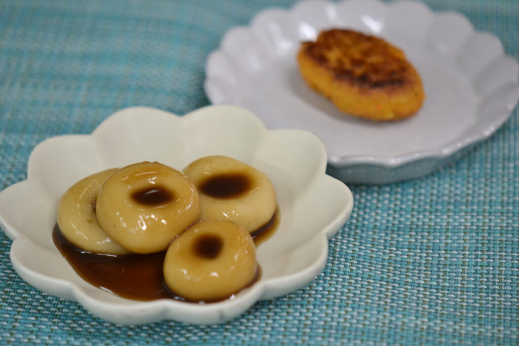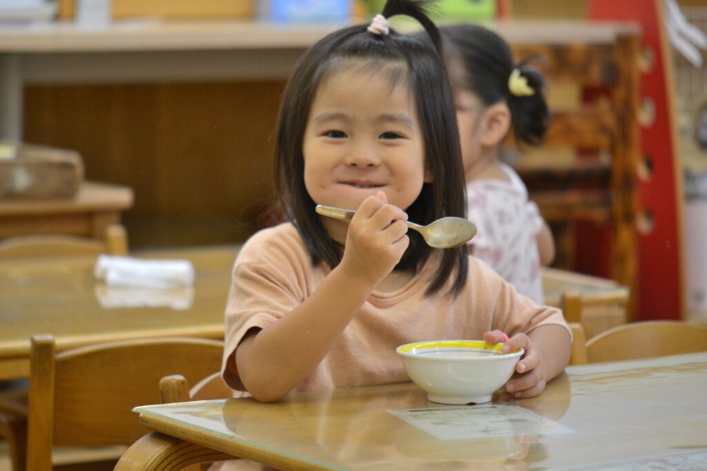 今日の昼食は、『夏野菜マーボー豆腐』でした。夏野菜は、こしこば菜園さんのなすと、ピーマンが入りました❣副菜は「野菜の梅肉和え」。きゅうりや人参、キャベツなどの野菜を、自家製の梅干しに、酢、みりん、しょうゆを混ぜた調味液で和えています。疲れをとる梅干しのクエン酸に、野菜のビタミンやミネラルが合わさって、この時期嬉しいさっぱりおかずです😊3時のおやつは『みたらし団子』でした。白玉粉と上新粉で作るモチモチのお団子に、甘じょっぱいみたらしあんをたっぷりと絡めて、みんなよくカミカミして食べていました。2歳児さんは豆腐入りの噛みやすいお団子を、1歳児さんは人参お焼きを食べました(^^♪