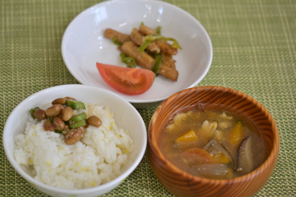 今日の昼食は『けんちん汁』でした。大豆から作った、手作り豆腐を使用しています🌱✨昆布・うるめ節・干し椎茸のだしの旨味がギュッと詰まった、美味しい汁物です。副菜は『高野豆腐のチンジャオロース』でした。お肉の代わりに高野豆腐を使用しています。味付けした高野豆腐に片栗粉をまぶして揚げ、こしこば菜園さんの美味しいピーマンと一緒に炒めました。味付けはにんにく・生姜・しょうゆ・みそ・昆布だしとシンプルですが、風味も味もしっかりついているので、ご飯のおかずになります😋お弁当などにもおすすめですよ♥