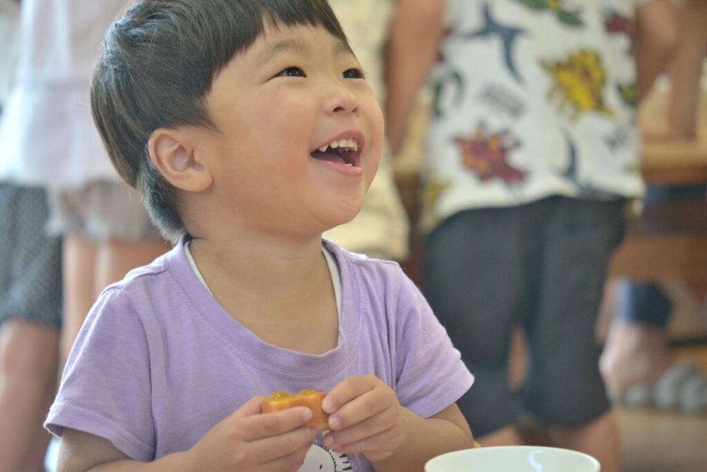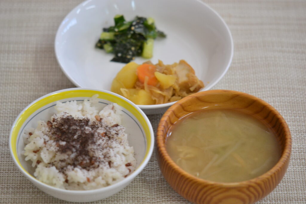 今日の昼食は、『切干大根の肉じゃが風煮』に、夏らしい、『きゅうりとわかめの旨だれサラダ』でした。サラダの旨だれは、自家製の塩麴と、玉ねぎ麹に、にんにく、ごま油、ごまを混ぜて作ります。歯ごたえを残したコリコリのわかめと、スティック状に切ったパリパリきゅうりが歯触り良く、あっさりしすぎない旨だれが食欲をそそる夏のおかずです🥒🥒3時のおやつは『甘酒ブレッド』でした。こちらは自家製の甘酒を使った米粉のパンです。今日は「梅ジャム」をトッピングに添えました😊2歳児さんのS君も、「梅、美味しいよ~♪」とにこにこで食べてくれました♡