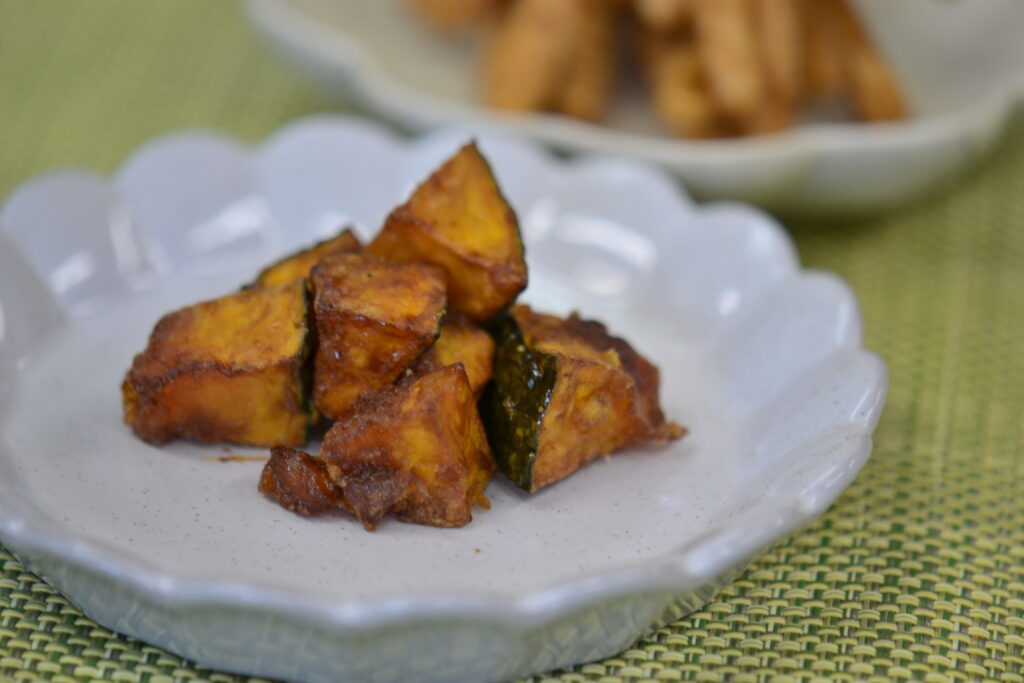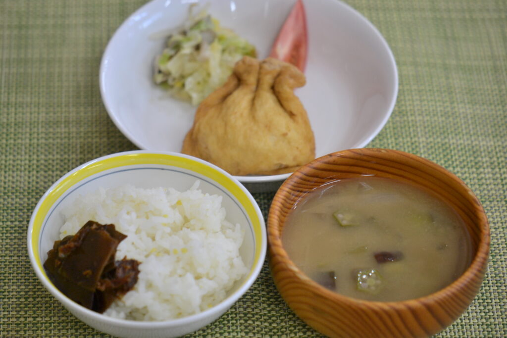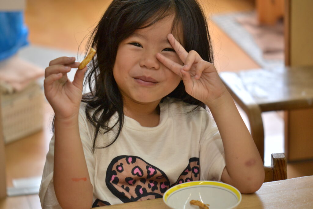今日の昼食は、『豆腐巾着』に『塩麴ナムル』が副菜でつきました。園の塩麴ナムルは自家製の塩麴と、ごま油、にんにく少々で味をつけます。和える野菜は季節によって、好みによって変えますが、今日の野菜はキャベツ、もやし、しめじでした。にんにくはごま油で軽く加熱して香りを引き出します。塩麴も野菜のうま味を生かす働きをしてくれるので野菜がとっても美味しく感じられるんですよ😊今日は年長さんのS君が、「今日の野菜、めっちゃ美味しかったよ~❢」と直接教えてくれ、とても嬉しく思いました(^^♪3時のおやつは、『黒糖かりんとう』でした。かりっかりの歯ごたえでみんないい音をさせて楽しそうに食べていました❣1~2歳児さんにはまだ少し硬いため、かぼちゃに米粉をまぶして揚げ、黒みつをからめた、「野菜のかりんとう」を別メニューでだしています。