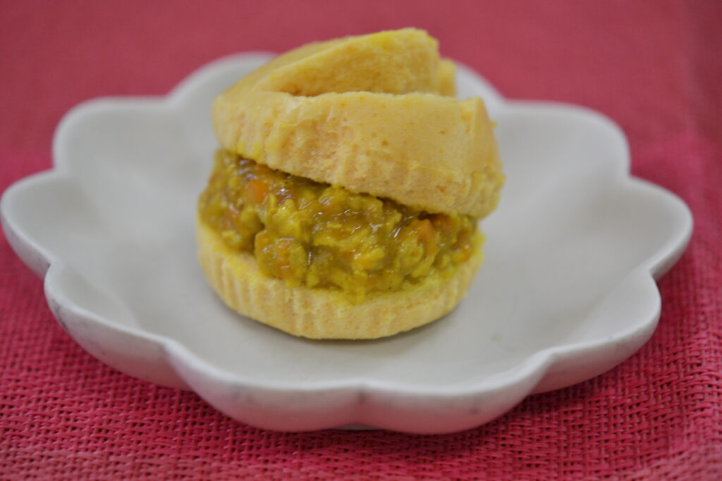 今日の昼食は、『高野豆腐の照り焼き』でした。このメニューはとっても簡単❣柔らかく戻した高野豆腐に片栗粉をまぶして揚げ、しょうゆとみりんの甘辛だれを絡めて出来上がりです。子供にも人気のメニューですよ♡高野豆腐は良質なたんぱく質や、カルシウム、鉄分など、豊富な栄養素が含まれていて、骨の健康維持や貧血予防、生活習慣病なども予防してくれるので、色んな年代に、おすすめしたい食材です。3時のおやつは、『カレーまん』でした。ターメリックを加えて黄色く色付けした蒸しパン生地に挟むのは、具材を炒め、ブレンドしたスパイスで味を整えた「かれーあん」です。お好みで挟めるよう、あんをサンドして食べる形にしています☺