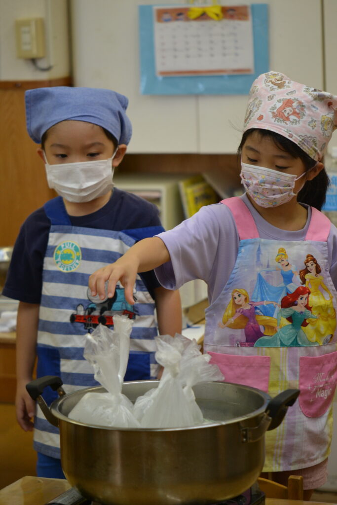 今日は9月1日『防災の日』にちなんで、給食も防災メニューにしてみました。午前中は年長さんとパッククッキングに挑戦しました。無洗米で作るわかめご飯、調味液を入れて湯せんにかける高野豆腐の煮物、乾物を使った切干大根のサラダを作りました♪年中さん以下の給食は、アルファ化米のわかめご飯と、調理室でパッククッキングで作ったおかずを提供しました。自然災害とは何か?非常時はどう対処したらよいのか?子どもたちと考える良い機会となりました(^^)🌟パッククッキングについてはお便りにも載せているので、是非目を通されてみてください♥