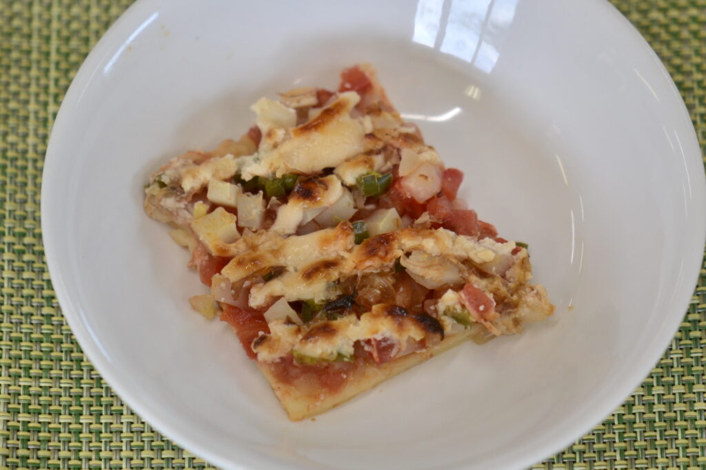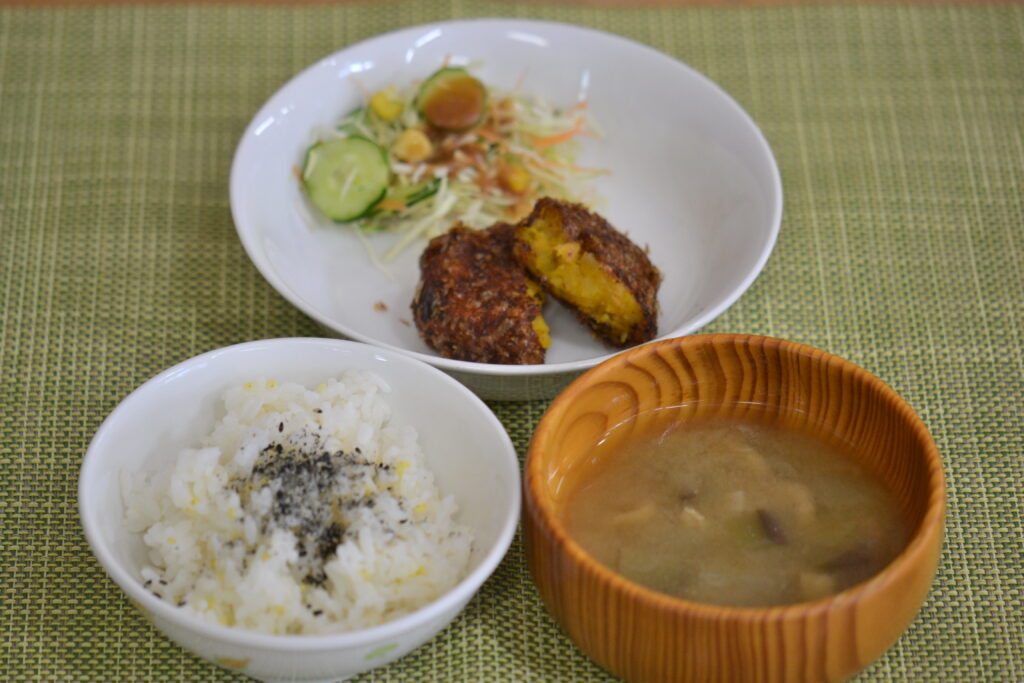 今日の昼食は『かぼちゃコロッケ』でした。お肉の代わりに大豆ミートを使用し、米粉とかつお節の衣をつけて揚げています。パン粉の代わりに使用している、かつお節の旨味と香ばしい香りで、さらに美味しくなります♪3時のおやつは『米粉ピザ』でした。豆腐と米粉で作った生地に、自家製ケチャップをぬり、夏野菜をのせ、手作りした豆乳マヨネーズをかけて焼いています。今日はいつも以上に子どもたちにも人気だったようでした(^^)♡