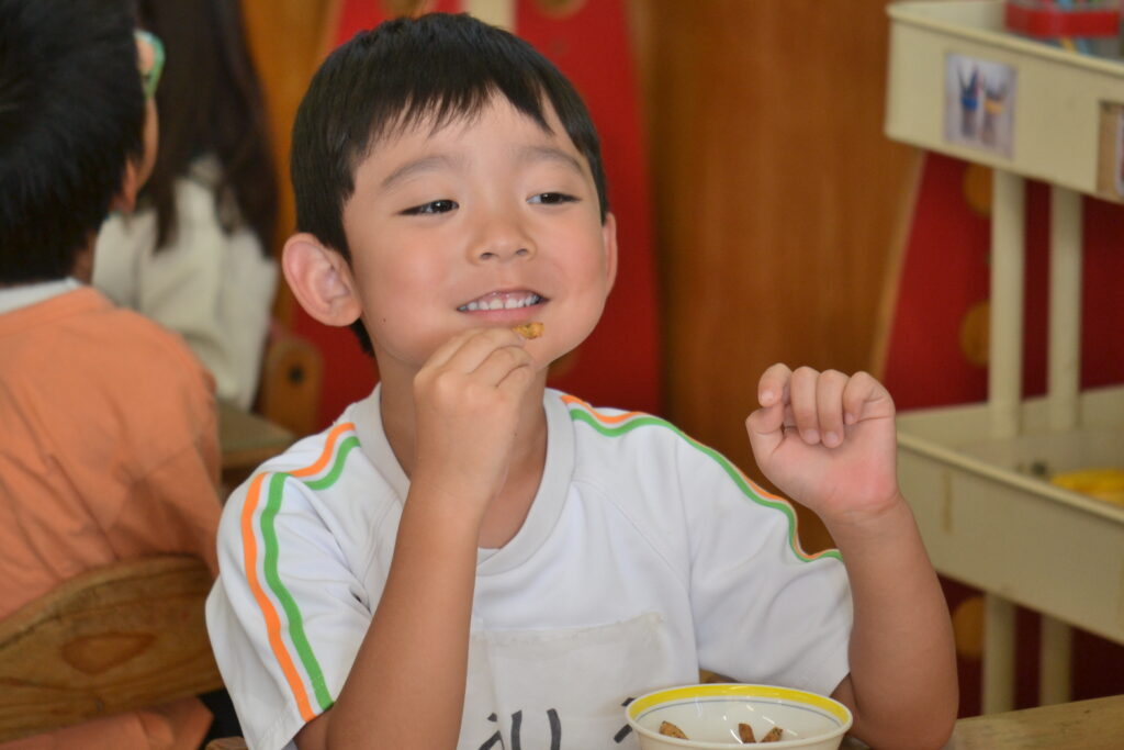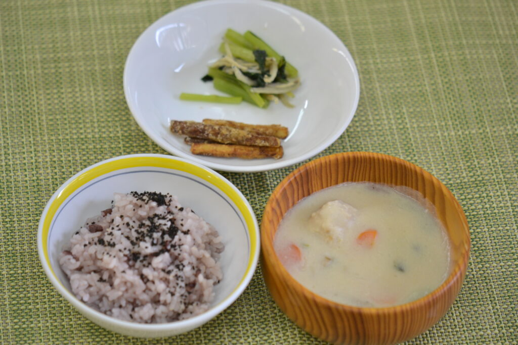 今日の昼食は『肉団子シチュー』でした。鶏ミンチに高野豆腐を混ぜることで、栄養価もボリュームもアップさせています♪シチューは市販のルゥや、乳製品は一切使用せず、豆乳と自家製の塩麴で作っています。うま味たっぷりで、脂っこさのない、優しい味のシチューです✨3時のおやつは初登場の『ごまかりんとう』でした。米粉の生地にごまを練り込んでいます。カリカリで美味しかったですよ♥子どもたちにも大人気でした😊✨