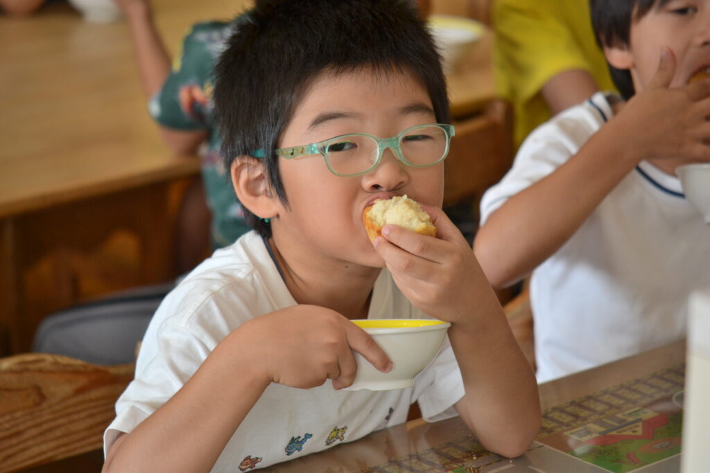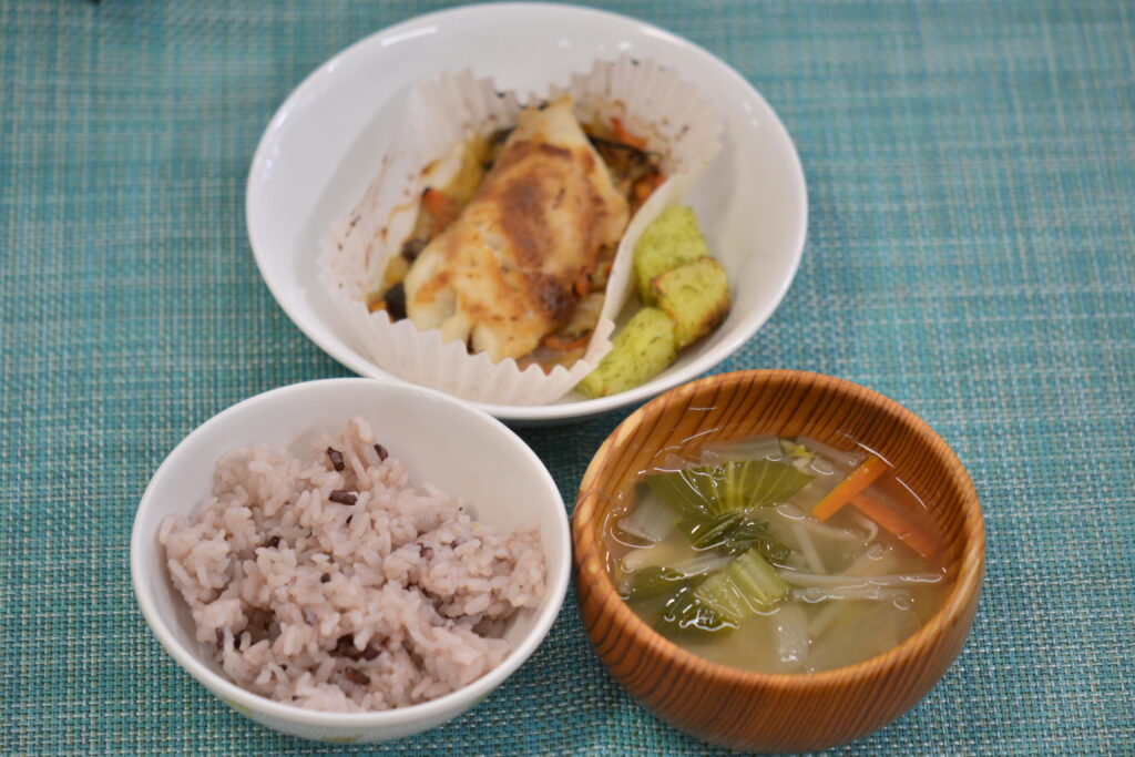 今日の昼食は『魚のちゃんちゃん焼き』でした。お魚はタラでしたよ🐟✨魚の切り身と野菜にみそだれをかけて焼きました。みそと赤みそをブレンドしているので味に深みが出て美味しくなりますよ♪3時のおやつは『きな粉揚げパン』でした。米粉で作った蒸しパンを油で揚げ、きな粉をまぶしています。外はカリカリ、中はふわふわで美味しいんですよ😊✨人気おやつです💗