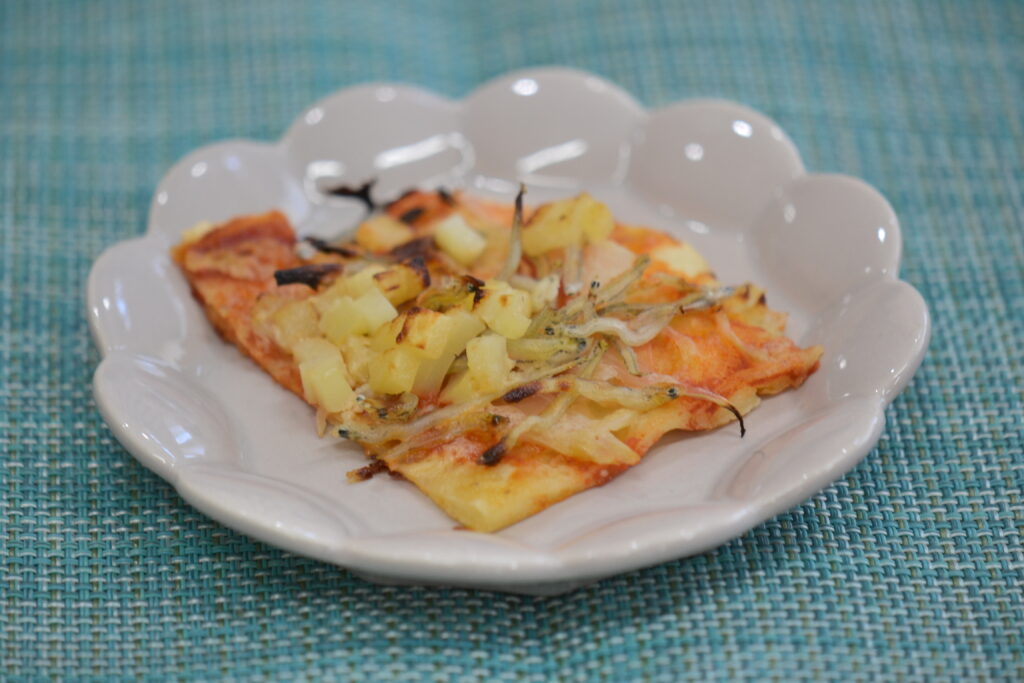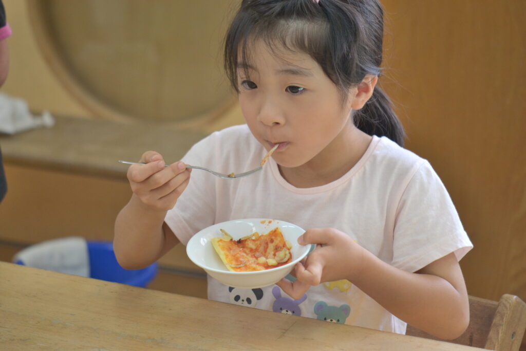 今日の昼食は、『マーボー豆腐』でした❣園のマーボー豆腐は、お肉を使わず、「大豆ミート」を使って作ります。大豆ミートは、絞った大豆から油分を除き、たんぱく質を繊維状に固めて加工した食品です。形状もミンチ、ばら肉状、から揚げ肉状と様々あるので、用途に応じて使い分けていますよ😊辛味調味料は使わず、にんにく、生姜で風味を出したら、具材を炒め、しょうゆ、みりんに2種類のみそを使い辛味のないコク深い味わいのマーボー豆腐に仕上げます。3時のおやつは『米粉のピザ』でした🍕🍕ちりめんやじゃが芋、玉ねぎなどの具をたっぷりのせて、自家製のケチャップと、豆乳マヨネーズをトッピングしてこんがり焼き上げます。給食室からピザの焼ける良い匂いが漂っていましたよ~♪