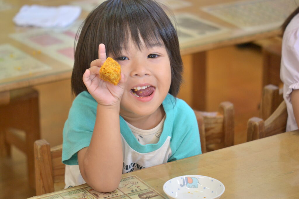 今日の昼食は、『ひよこ豆と野菜のカレー』でした。副菜は『コールスローサラダ』❣今日のコールスローサラダには、これからの時期が一番美味しい、りんごも入りましたよ🍎りんごが入ることで、さわやかな甘酸っぱさやシャキッとした歯触りが加わり、いつもよりもっと、美味しいコールスローになりました。今日は箸休めの福神漬けもオススメ❣れんこんと人参を薄く切ってさっと湯通しし、たれに漬け込みます。カリカリの歯触りと、甘辛い味が、自家製のカレーの味を引き立てていました。3時のおやつは、『キャロットケーキ』でした。細かくした人参をたっぷり使って、米粉や手作りの豆乳ヨーグルトでふんわりと焼き上げています🥕「先生、美味しいよ~」の声がたくさん聞かれて、とても嬉しく思いました♡