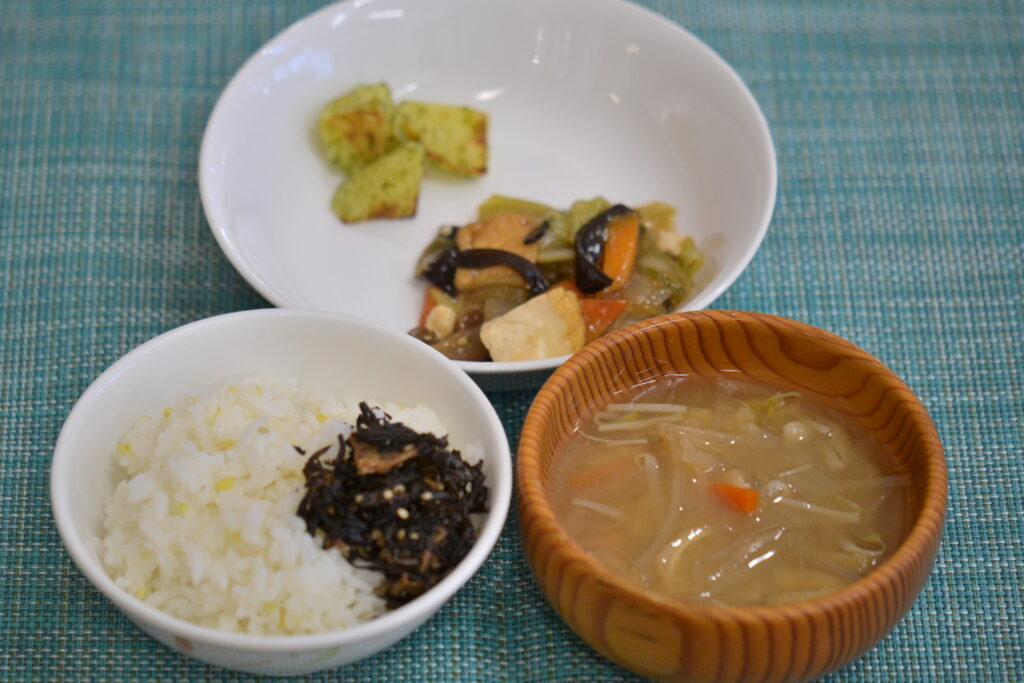 今日の昼食は、『八宝菜』でした。八宝菜の「八宝」とは、(多くの宝物=たくさんの具材)の意味だといわれ、具材の数は決まっていません。園では、肉は使わず、厚揚げや昆布、椎茸のだしを使い、たっぷりの野菜を入れてしょうゆ、みりんであっさりした味に仕上げます。ごま油で炒めたにんにく、しょうがの風味も良いアクセントになっていますよ😊3時のおやつは、『米粉と甘酒のアップルケーキ』でした🍎自家製の甘酒と、煮たりんごを混ぜ込んで焼く、甘さ控えめのケーキです。りんごの季節だけの、限定おやつで、今日は約1年ぶりの登場でした❣今日も「これ美味しい~」「おかわりある?」の声がきけて嬉しく思ったことでした💕