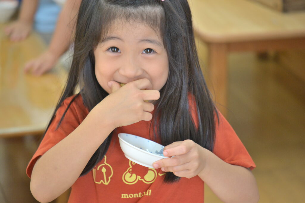 今日の昼食は、人気メニューの『かぼちゃコロッケ』に、副菜は野菜サラダでした。ドレッシングは、『塩麴ごまドレッシング』をつけました。自家製の塩麴を使って、炒ったごまにみりん、お酢、ごま油をミキサーでいっぺんに攪拌します。塩麴の優しい塩味と、ごまの風味がきいた簡単ドレッシングですよ😊3時のおやつは、昨日子どもたちが津奈木の山崎さんの畑で収穫してきてくれた、さつま芋を使った、『スイートポテト』でした🍠「えー❣これ僕たちが昨日掘ったお芋だって❣」とみんな嬉しそうに食べていましたよ💓甘いさつま芋に、思わずニッコリ顔になった子どもたちでした😊