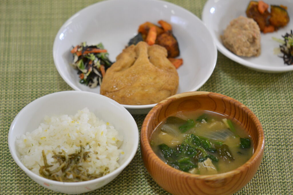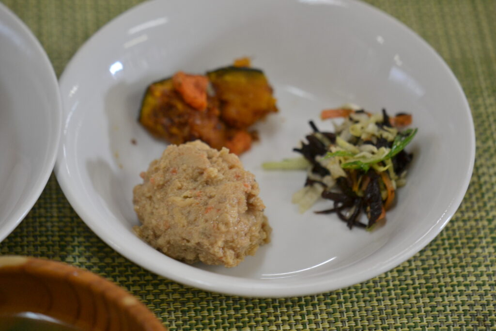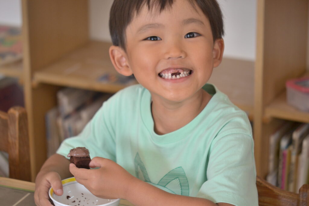 今日の昼食は、『豆腐巾着』でした❣油揚げの中には鶏ミンチ、豆腐、切干大根や干し椎茸にきくらげなどの具材を入れて、甘辛いつゆで煮ます。油揚げに美味しいだしがよく浸みて、ふっくら、ジューシーですよ~😊1~2歳児さんは、食べやすいよう、油揚げは刻んで具材に混ぜ込み、肉団子にして出しています。3時のおやつは、『ココアケーキ』でした。トッピングは、「豆腐のガナッシュ」❢絹豆腐で作る、滑らかな自家製チョコソースです🌟みんなケーキにたっぷりとのせて美味しそうに頬張っていました💓