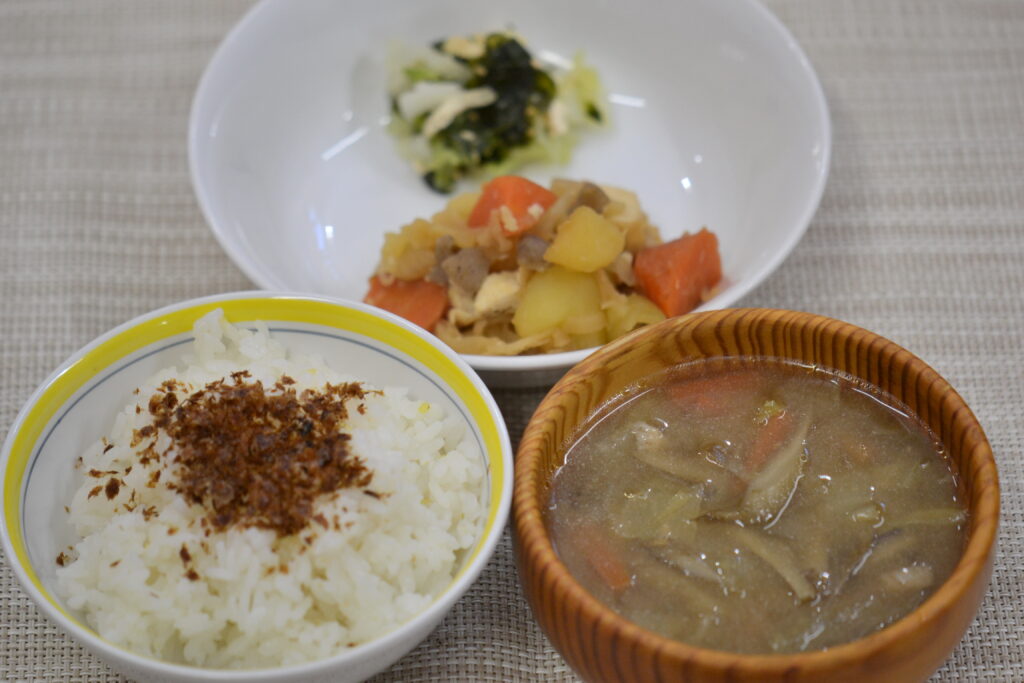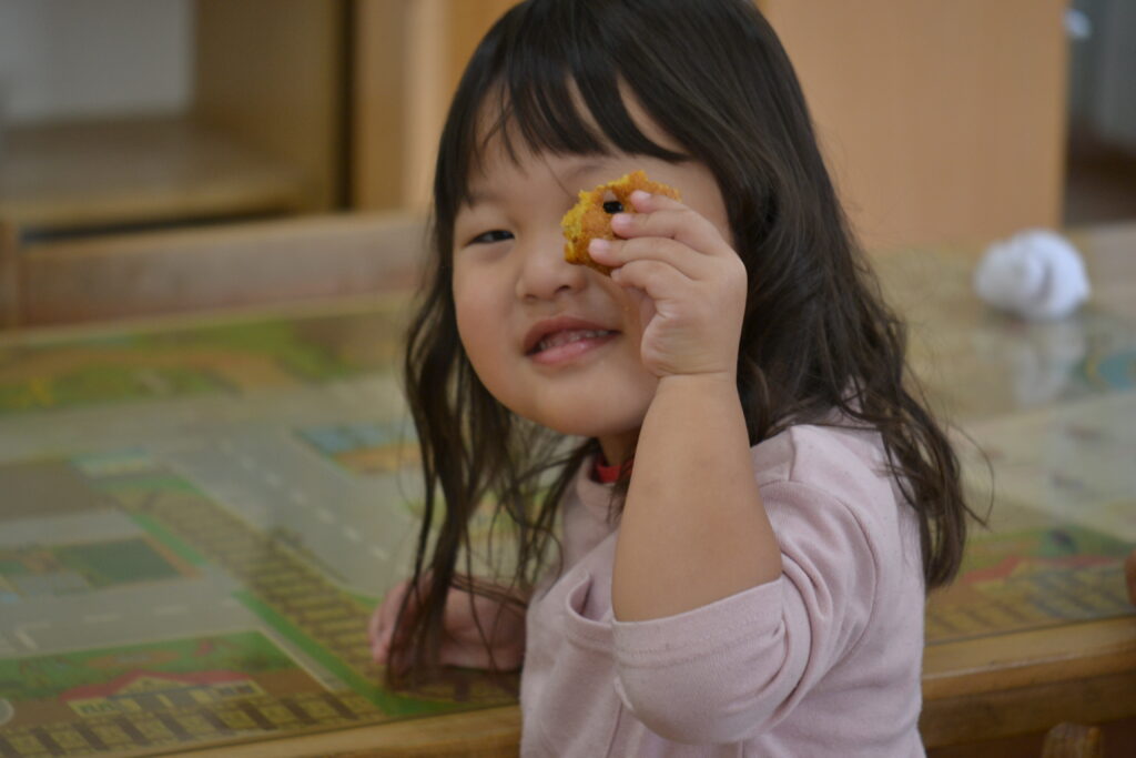 今日のおすすめメニューは、『おみそ汁』です❣園のおみそ汁は、入れる具や、組み合わせるメニューによって、❝いりこ❞か❝昆布とうるめ節❞のどちらかでだしをとります。今日の具材は、旬を迎える白菜に、ごぼう、人参、干し椎茸が入りました。みそ汁に入れるごぼうは、ささがきにして、ごま油で炒め蒸しし、風味やうま味を引き出します。このひと手間で、またより美味しいおみそ汁が出来るんです😊今日はまたグンと気温が下がったこともあってか、温かいおみそ汁をみんなよく食べてくれていました💓3時のおやつは『人参ドーナツ』でした🥕今日は、手作りの木綿豆腐を使って作りましたよ😊外はカリっと、中はほんわか人参の優しい甘味を感じられるおやつでした🌟