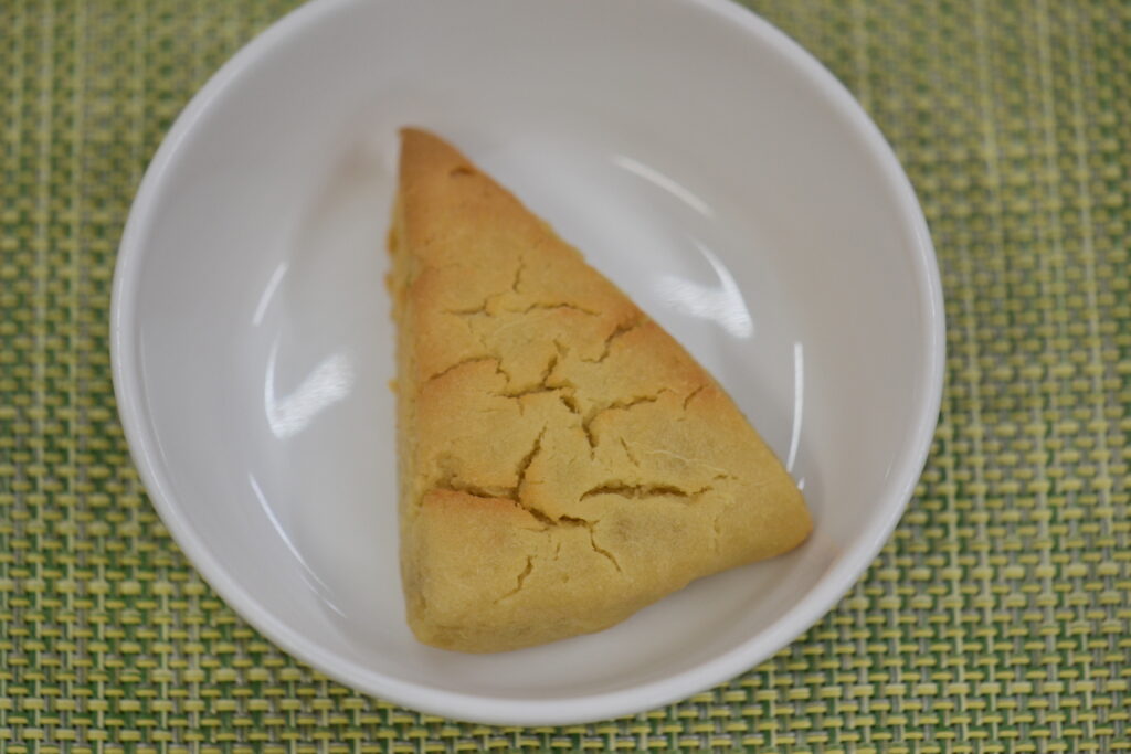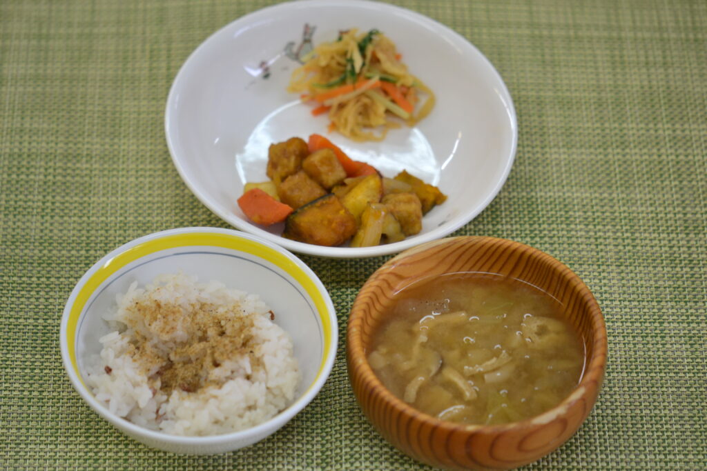 今日の昼食は「高野豆腐と野菜の甘酢あん」でした。味付けした高野豆腐に片栗粉をまぶして揚げ、素揚げしたほかの野菜と一緒に甘酢に絡めています。人参、玉ねぎ、れんこん、さつま芋、かぼちゃ、エリンギなど・・・野菜もたっぷりのおかずです🥕✨3時のおやつは「さつま芋スコーン」でした。子どもたちが掘ってきたさつま芋を使って作りました🍠✨蒸して潰したさつま芋に、米粉や豆乳と一緒に混ぜて生地を作っています。外は少し硬めですが、噛めば噛むほどおいしさを感じる、優しい甘さのおやつです😊💗