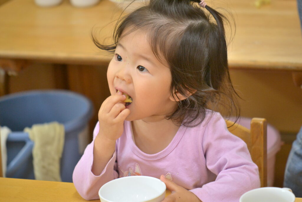 今日の『野菜の天ぷら』は、かぼちゃと舞茸でした。風味のいい舞茸も、甘いカボチャも子どもたちに大人気!!米粉の衣がカリカリ・サクサクで、より美味しく感じます😋✨3時のおやつの『スイートポテト』は、子どもたちが掘ってきたさつま芋を使っています。砂糖・牛乳・バターなどを使わずにどうやったらより美味しくなるのか…、豆乳の量を変えてみたり、りんごを入れてみたりと毎回工夫しながら作っています🍎✨今日は焼き色もよく、いつもよりしっとり目に美味しくできました(^^)♪