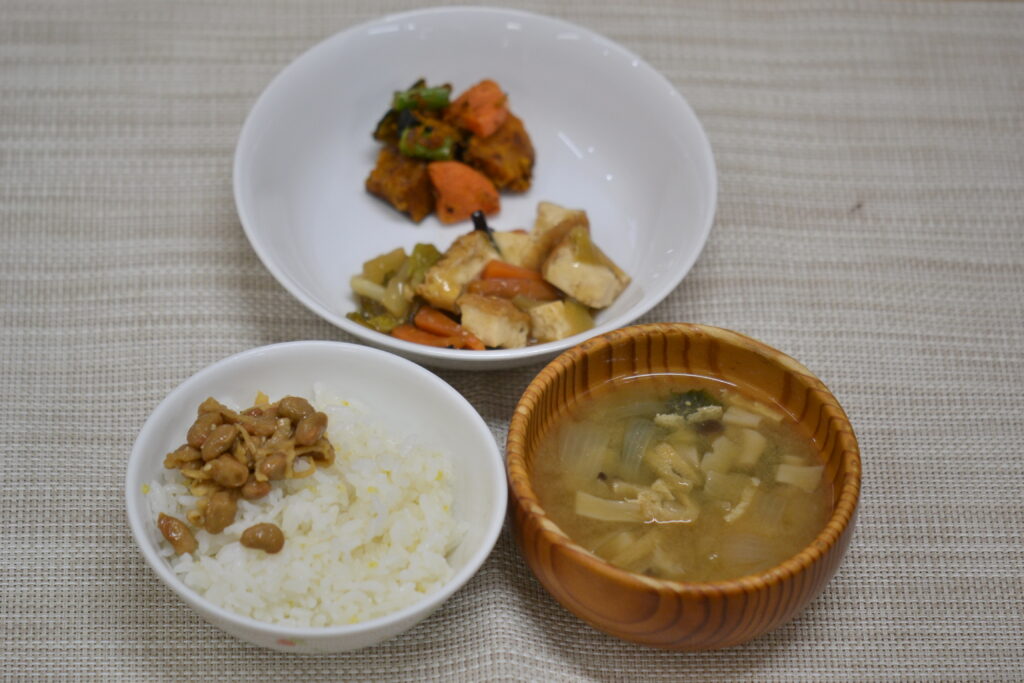 今日の昼食は『八宝菜』でした。園では、お肉の代わりに厚揚げを使用しています(今日の厚揚げは、豆乳から手作りしたものを使用しました😊✨)。にんにくとごま油で中華風味を出しながら、昆布だしと醤油、みりんのみで味付けした優しい味で野菜たっぷりなおかずです🥬✨3時のおやつは『菜飯』でした。小松菜とうるめ節をたっぷり使用した、栄養満点のおやつです🐟✨うるめ節の旨味やごまの風味で、青菜が苦手な子でも食べやすくなりますよ💗