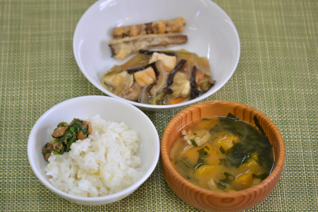 今日の副菜は初登場の『ごぼうの天ぷら』でした。ごぼうは下茹でしてから味をつけ、米粉と豆乳で作った衣にくぐらせて揚げました。衣はサクサクカリカリ♪美味しかったですよ~😋💗また、今日の納豆には青菜やごまなどをたくさん混ぜました✨納豆、ほうれん草、水菜、塩昆布、ごま、かつお節、しょうゆ、ごま油です!!かつお節やごま油を入れることで、香りが一気に良くなり、食欲をそそります🍚✨塩昆布を入れることで、旨味も塩味も増し、全体の味が引き締まります。ご飯にかけて食べても美味しいですが、ほうれん草などの野菜を多めに入れ、『青菜の納豆和え』の様にして食べるのもオススメです😊🍀