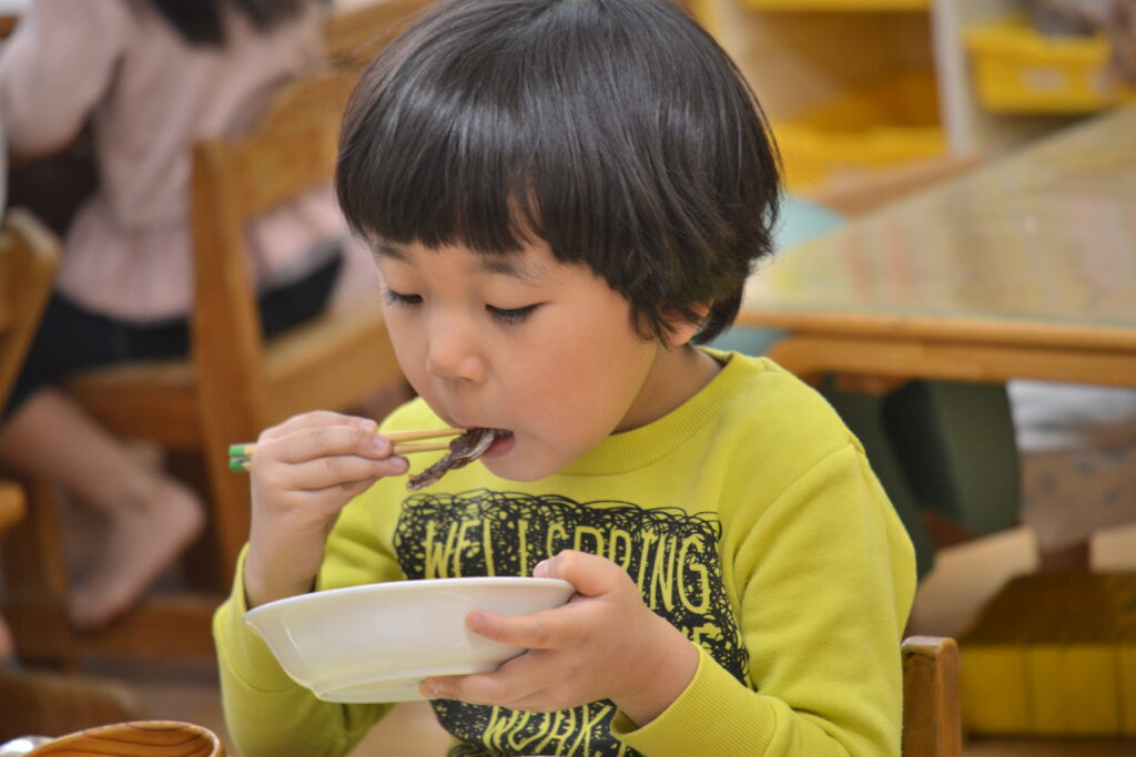 今日は、昨日年中さんが切って塩漬けしてくれた大根を使って『大根のゆかり和え』を追加で添えました。ゆかりの酸味と塩気でさっぱり美味しくいただけます。「すっぱ!!けど、おいしい♡」とみんなよく食べていますた。園庭の柿で作った干し柿も添えましたよ😊✨園やお家では、なかなか登場しないであろう干し柿ですが、意外にも子どもたちはよく食べていました!!噛むほどに濃厚な甘みが広がって美味しかったですよ♪
