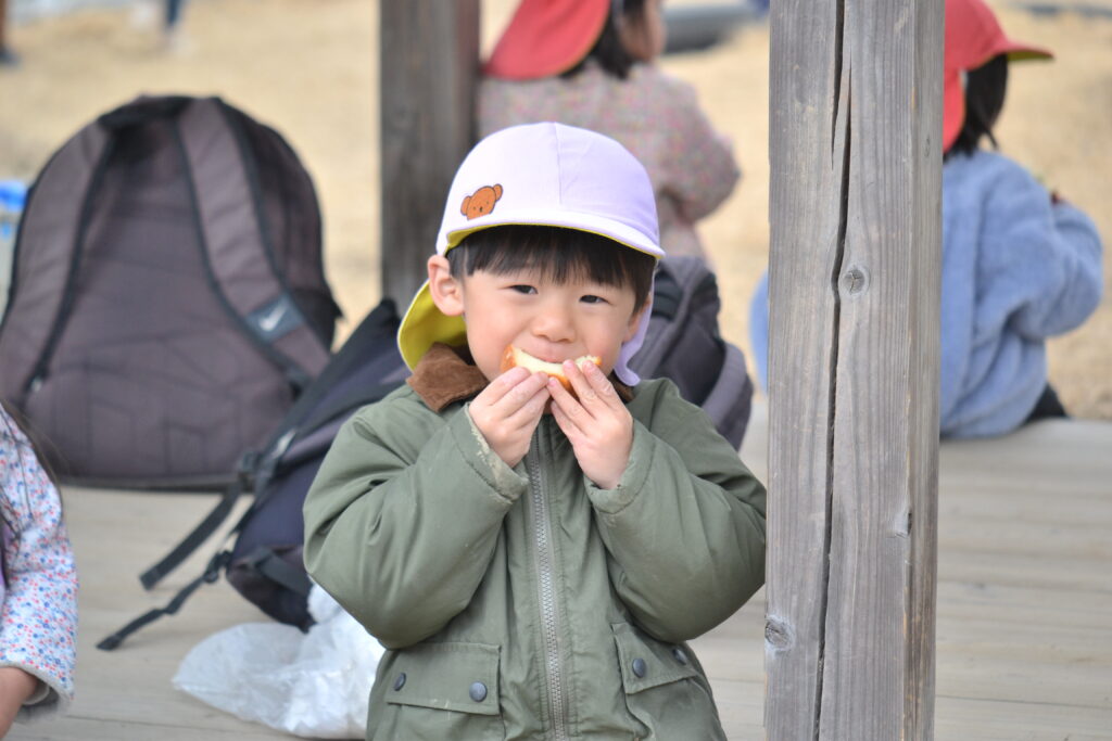 今日の副菜は「もちきびポテト」でした!じゃが芋と玉ねぎを炒め、もちきびと塩を入れてじっくり蒸し煮して作ります。シンプルな味付けですが、もちきびもモチモチ氏とした食感と、じゃが芋の甘みを感じられてとっても美味しいおかずです♪3時のおやつは、自家製の甘酒を使った「甘酒ブレッド」でした。今日はお外で食べた子どもたち・・・いつもとは違った環境で楽しそうに食べていました😊💕