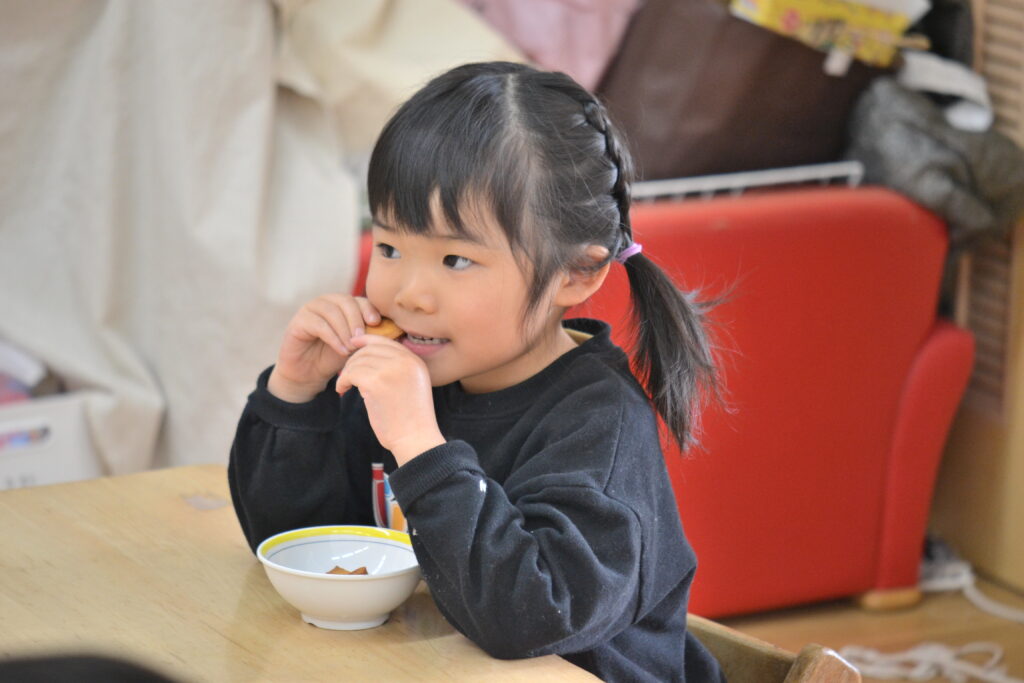 今日の副菜は、久々登場のチヂミでした!れんこん、人参、ニラ、米粉で作っています。れんこんの借者記した食感が美味しいチヂミです。子どもたちも良く食べていましたよ~♪3時のおやつは酒かすクラッカーでした。津奈木町の亀萬酒造さんの玄米酒かすを使用しています✨不思議と、チーズの様な風味のする美味しいおやつです。少し硬めなので、みんなボリボリといい音をたてながらよく噛んで食べていました😊💕