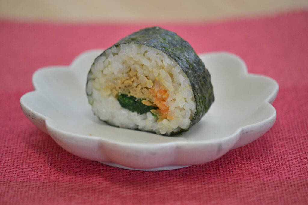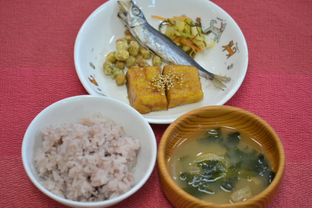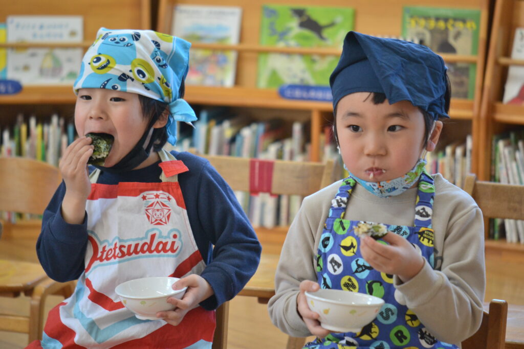 今日の昼食は、節分を意識した、『めざし』に、大豆で作る『のり塩ビーンズ』でした🌟「めざし」はイワシの塩漬けを干したもので、1年に1度節分の限定メニューです❣軽く焼いて、1~2歳児さんは食べやすいように身を開いて提供しますが、3~5歳児さんは1尾ずつ。尾頭付きのめざしに、「かおが怖いよ」とおっかなビックリしている子もいましたよ😊3時のおやつは、『恵方巻』。3~5歳児さんは味付けした高野豆腐、ほうれん草、人参を巻いて、1~2歳児さんは海苔なしの、チラシ風に具を混ぜたおにぎりを食べました。1階のお部屋の年中、年長さんは今日はクッキングで、自分たちで恵方巻に挑戦しましたよ❢とても上手に巻けたようで、今年も良い節分になりました💕