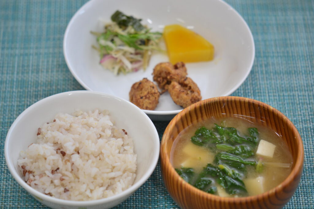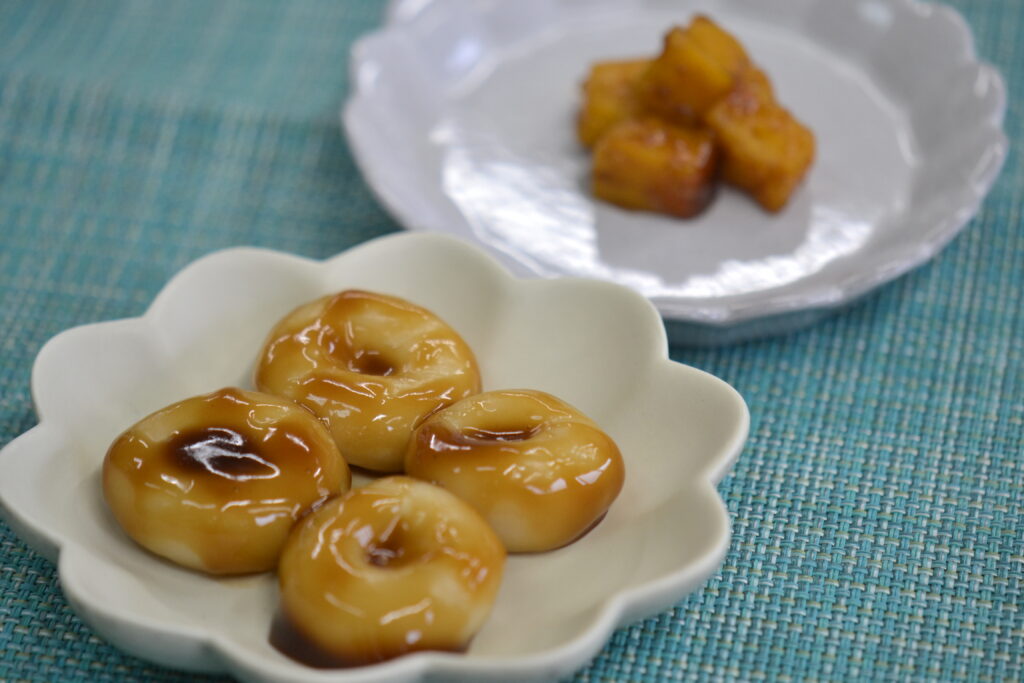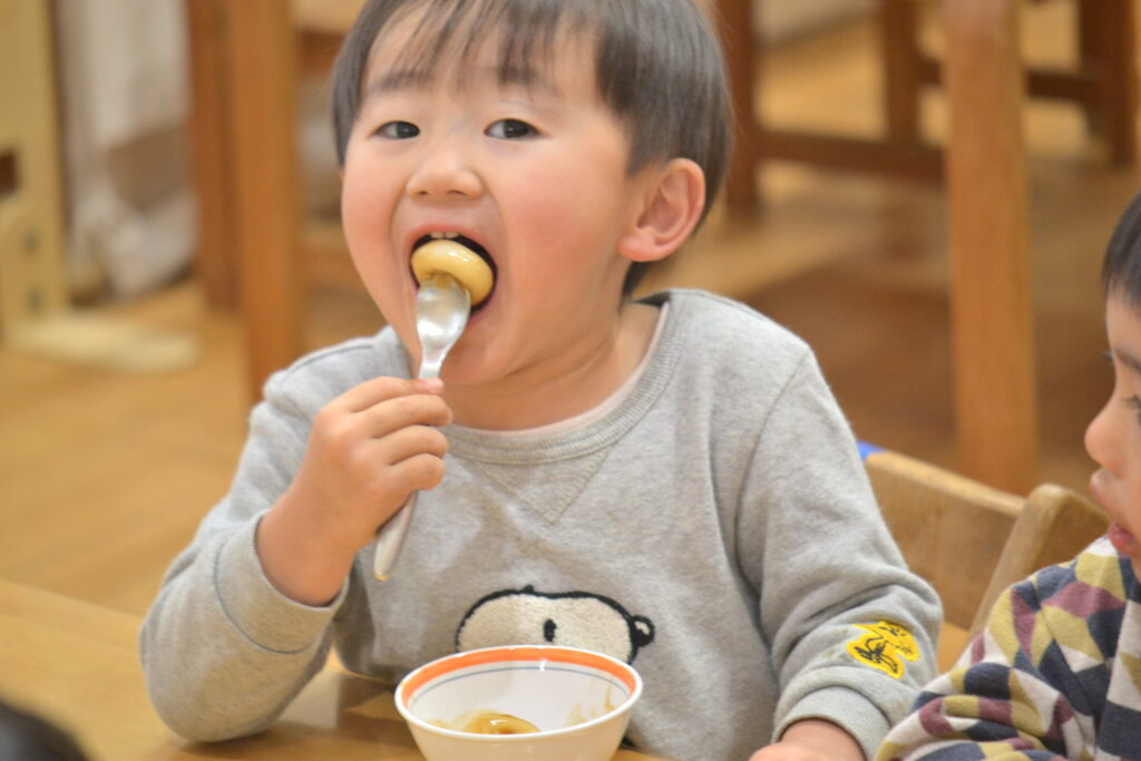 今日は、昼食の『じゃこと海藻の大根サラダ』が新メニューで登場しました❣大根は、「こしこば菜園」さんのみずみずしく辛味の少ない大根を使いました🌞細く千切りにした大根に、カリっと揚げたちりめん、水菜、わかめ、紫玉ねぎなどを混ぜて、彩りよく、それぞれの歯ごたえも生かしつつ仕上げました🌟味付けは、自家製の「塩麴ごまドレッシング」❢ごまの風味がきいて、色々な味や食感が楽しめるサラダでしたよ✨3時のおやつは、『みたらし団子』でした。2~5歳児さんは、白玉粉と上新粉で作る白玉団子を、1歳児さんは軟らかく噛みやすい、かぼちゃと米粉で作る「かぼちゃ団子」をそれぞれ甘辛いみたらしのタレにからめて食べました🥰