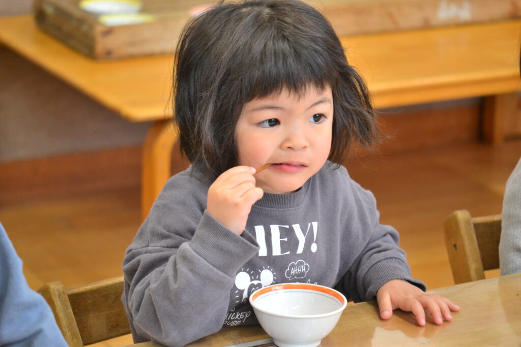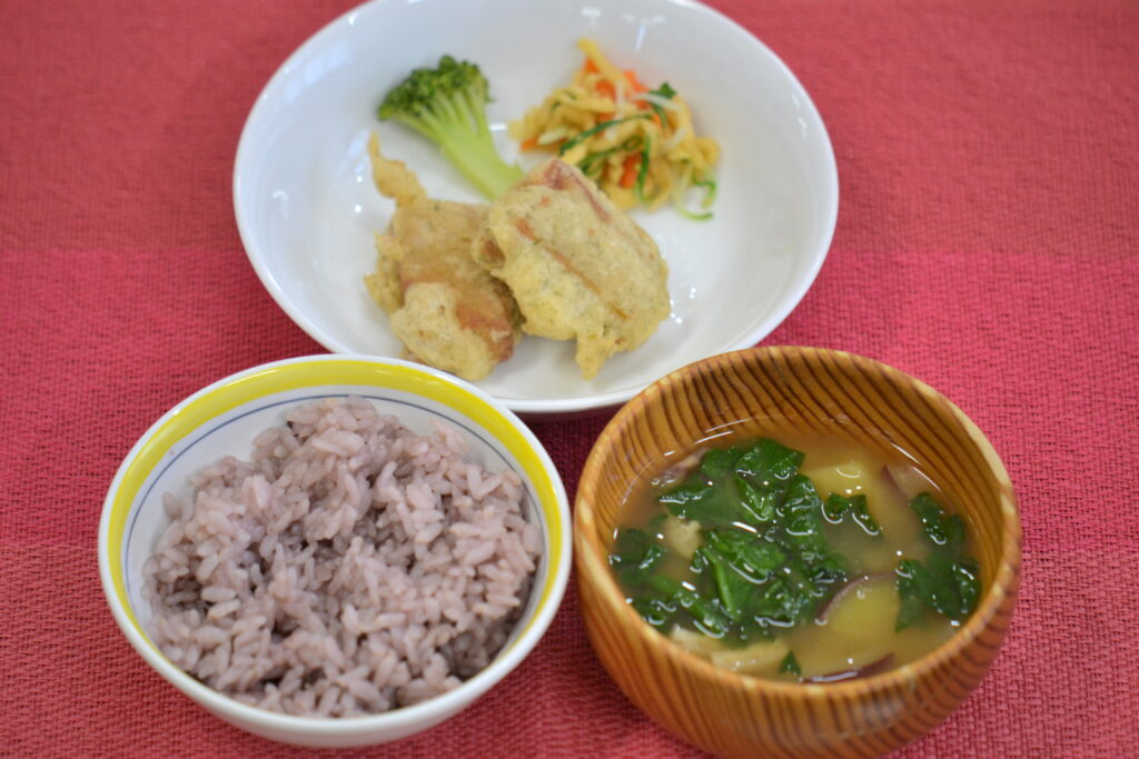 今日は年長K君のリクエストで『高野豆腐の磯辺揚げ』でした。味付けした高野豆腐に、米粉で作った衣をつけて揚げています。カリカリ♪サクサク♪で美味しいですよ😊💗3時のおやつは『酒かすクラッカー』(2~5歳児のみ)でした。津奈木町の亀萬酒造さんの玄米酒かすを使用しています。不思議とチーズの様な風味がし、噛むほどに味が広がるおやつです。「かた~い!でも、おいしい~!」と、子どもたちも奥歯で上手に噛みながら食べていました。