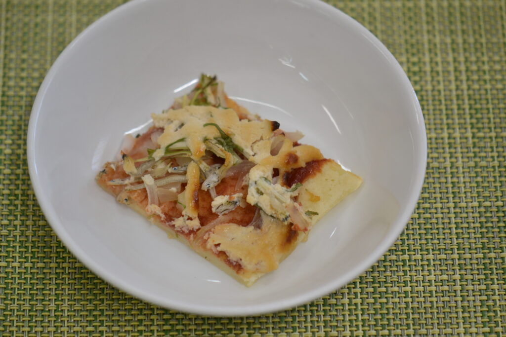 今日は『魚の甘酢から揚げ』でした。お魚はサバでしたよ🐟✨魚と蓮根に片栗粉をまぶして揚げ、甘酢を絡めています。ご飯がよくすすみます🍚✨3時のおやつは『米粉ピザ』でした。米粉と豆腐で作った生地に、自家製ケチャップをぬり、野菜をのせ、チーズの代わりに手作りの豆乳マヨネーズをかけて焼いています。モチっとした生地・ケチャップの甘み・野菜とちりめんの旨味・香ばしさが合わさって、とってもおいしいピザが出来ます🍕