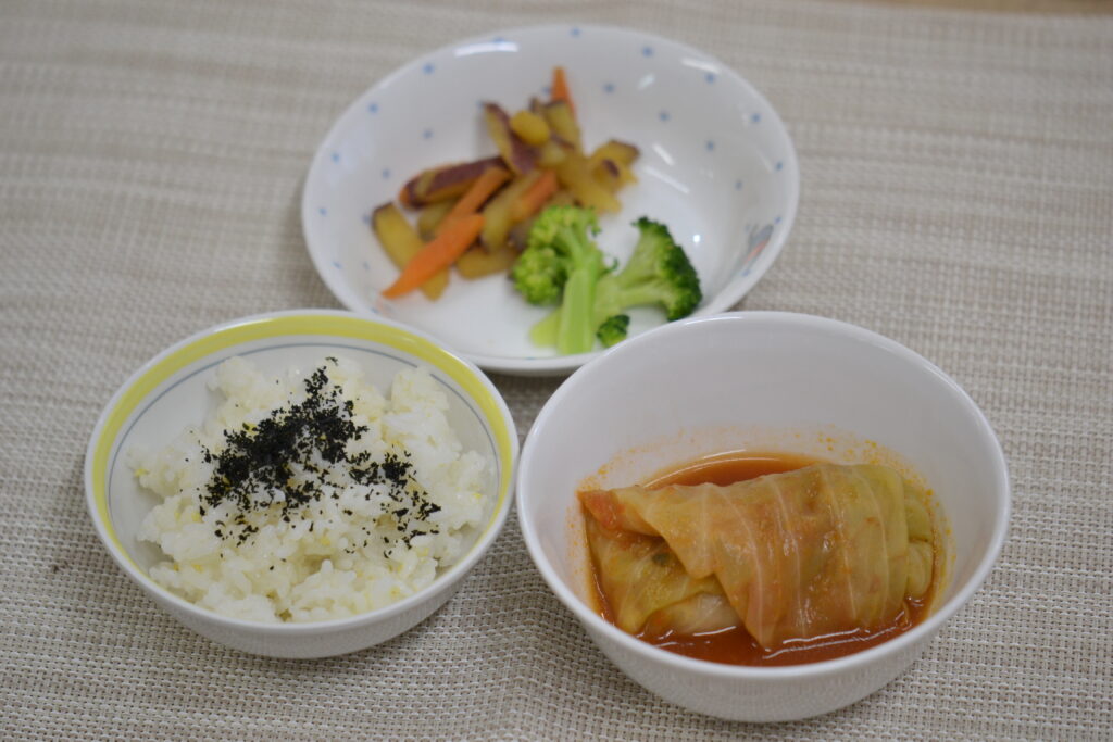 今日の昼食は、今が旬の春キャベツをふんだんに使った『ロールキャベツ』でした✨中には、鶏ミンチに玉ねぎや高野豆腐を加えて作った、たんぱく質たっぷりの肉団子を入れて、1つ1つ丁寧に包みました。ホールトマトと昆布だし、しょうゆとみりんで味付けした和風味です。春キャベツは葉が柔らかく甘みがあるのが特徴で、サラダなどにすることも多いですが、こうやって煮込み料理にすると、トロトロで味の浸みた美味しいロールキャベツになります😋💕子どもは大人に比べて口も小さく、そしゃく・嚥下機能も未熟なので、普通のキャベツで作るよりも春キャベツで作った方が食べやすくなります。サラダ、炒め物、スープなど色んな料理を楽しめる春キャベツ、今1番のおすすめ食材です✨